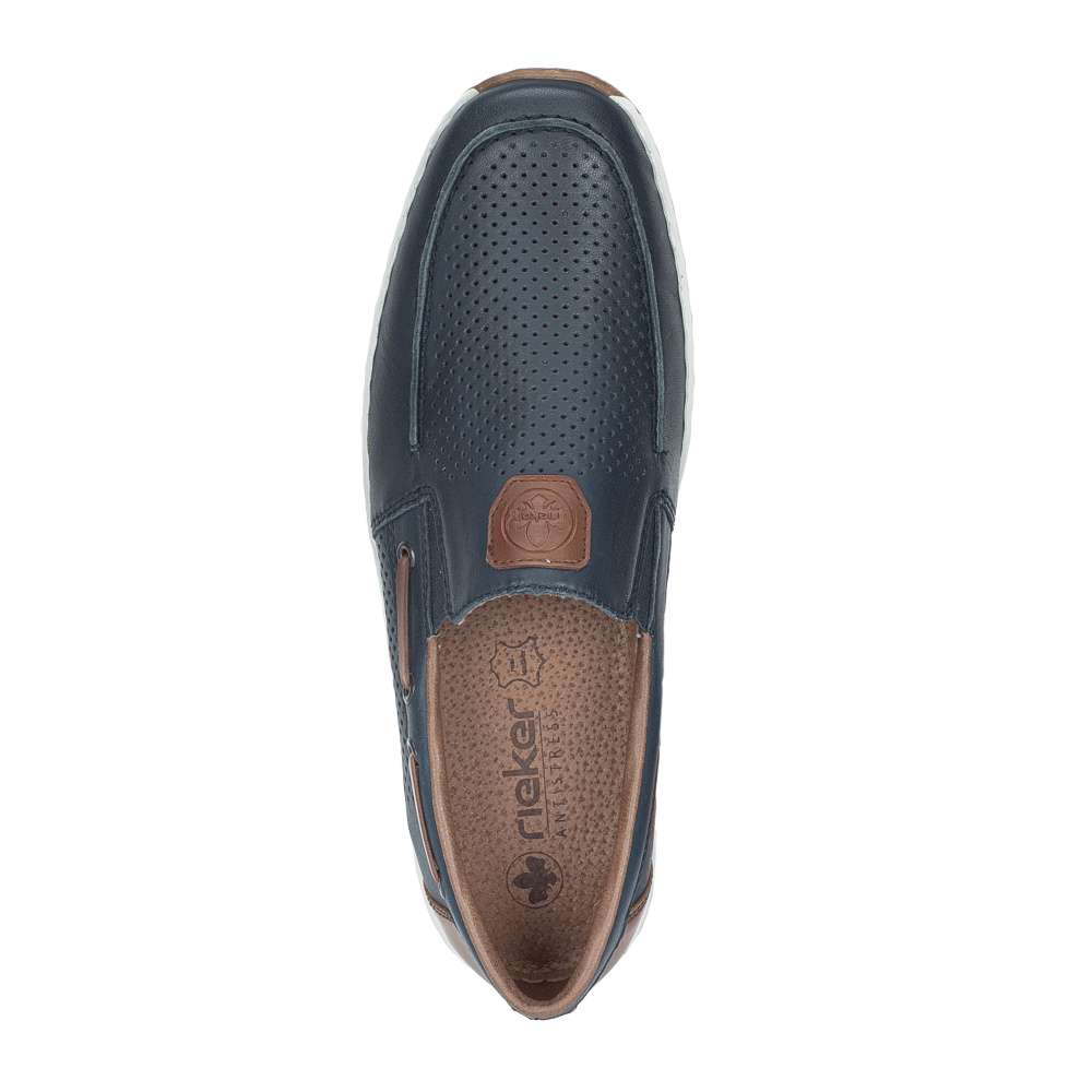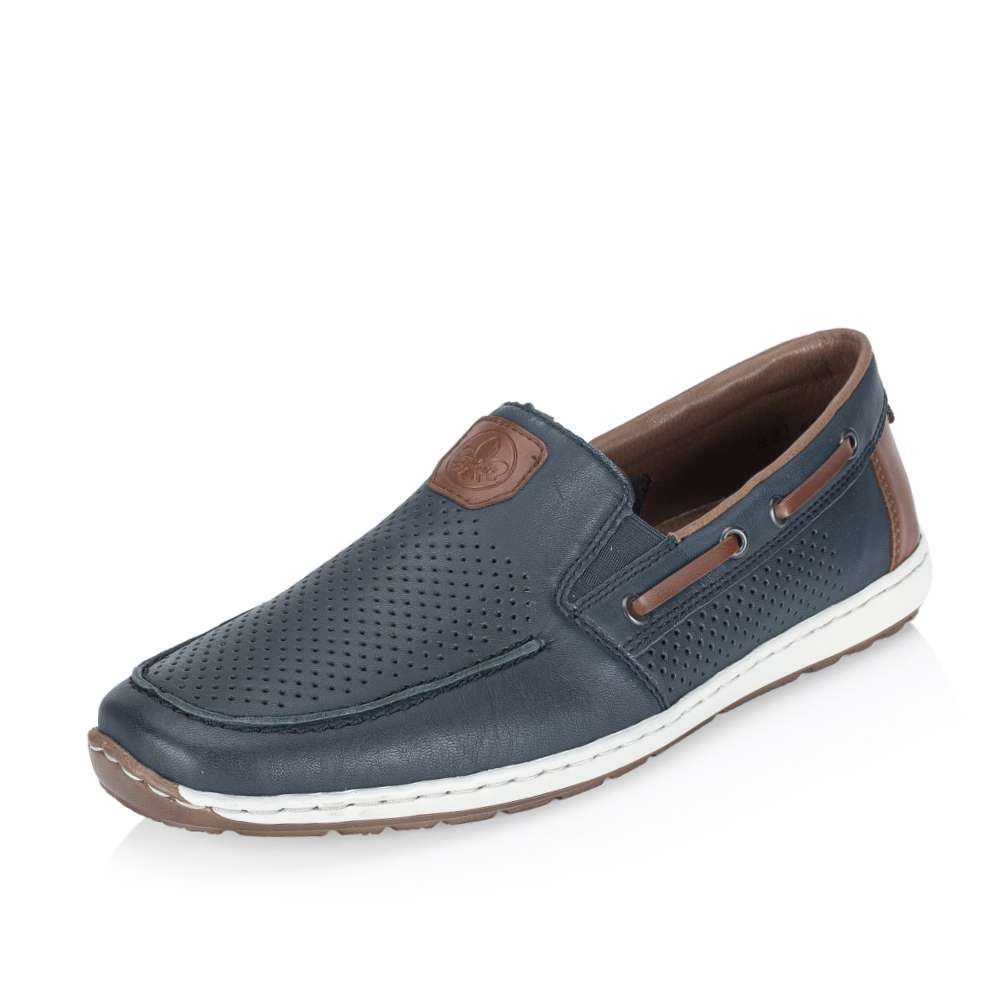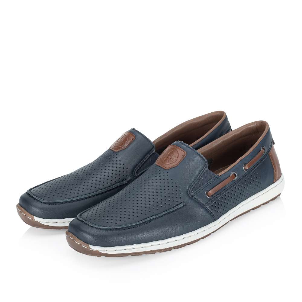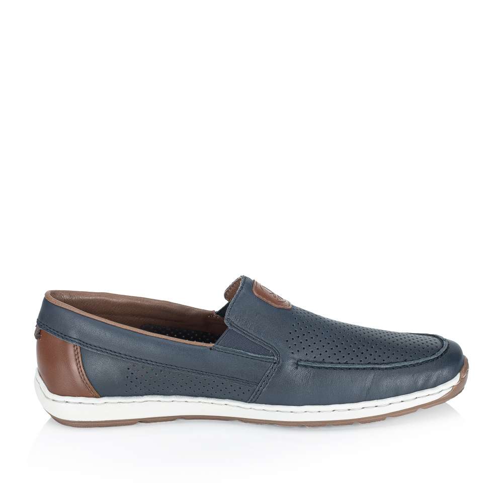 Tyto pánské mokasíny značky RIEKER nabízí dokonalou rovnováhu mezi stylem a pohodlím. Design mokasín je nadčasový a univerzální, díky čemuž se hodí pro každodenní nošení, do práce i pro volný čas. Kožený svršek bot je doplněn perforovaným vzorem, efektními aplikacemi a nášivkou s logem značky, které přidávají modelu atraktivní vzhled. Pružné gumičky po stranách nártu zajišťují snadné obouvání a zároveň umožňují optimální přizpůsobení noze. Flexibilní podešev s tlumením nárazů zajišťuje pohodlnou chůzi během celého dne a dodává pocit stability při každém kroku. Tento model je ideální volbou pro muže, kteří nechtějí dělat kompromis mezi atraktivním vzhledem a komfortem.