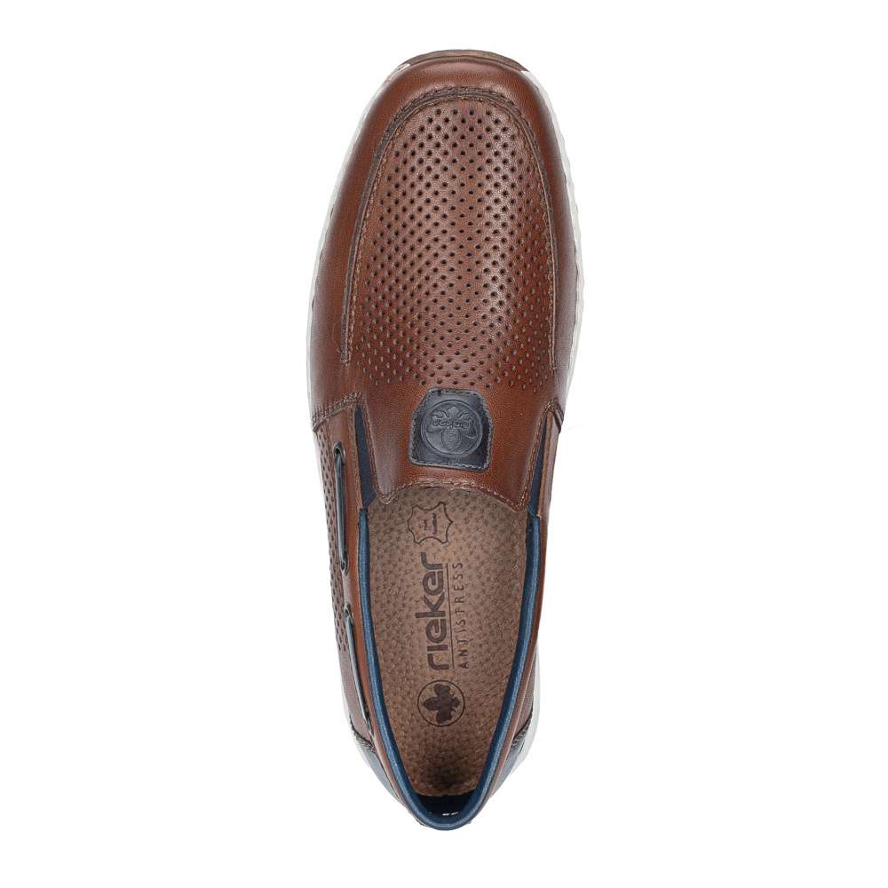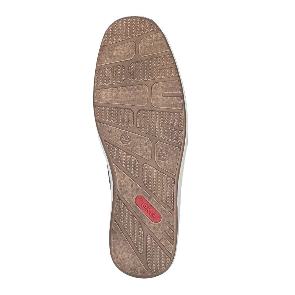 Tyto pánské mokasíny značky RIEKER nabízí dokonalou rovnováhu mezi stylem a pohodlím. Design mokasín je nadčasový a univerzální, díky čemuž se hodí pro každodenní nošení, do práce i pro volný čas. Kožený svršek bot je doplněn perforovaným vzorem, efektními aplikacemi a nášivkou s logem značky, které přidávají modelu atraktivní vzhled. Pružné gumičky po stranách nártu zajišťují snadné obouvání a zároveň umožňují optimální přizpůsobení noze. Flexibilní podešev s tlumením nárazů zajišťuje pohodlnou chůzi během celého dne a dodává pocit stability při každém kroku. Tento model je ideální volbou pro muže, kteří nechtějí dělat kompromis mezi atraktivním vzhledem a komfortem. Technologie: Antistress – díky čtyřem antistresovým vlastnostem – lehkosti, pružnosti, prostornosti a vynikající absorpci nárazů – vám boty RIEKER nabídnou komfortnější chůzi.