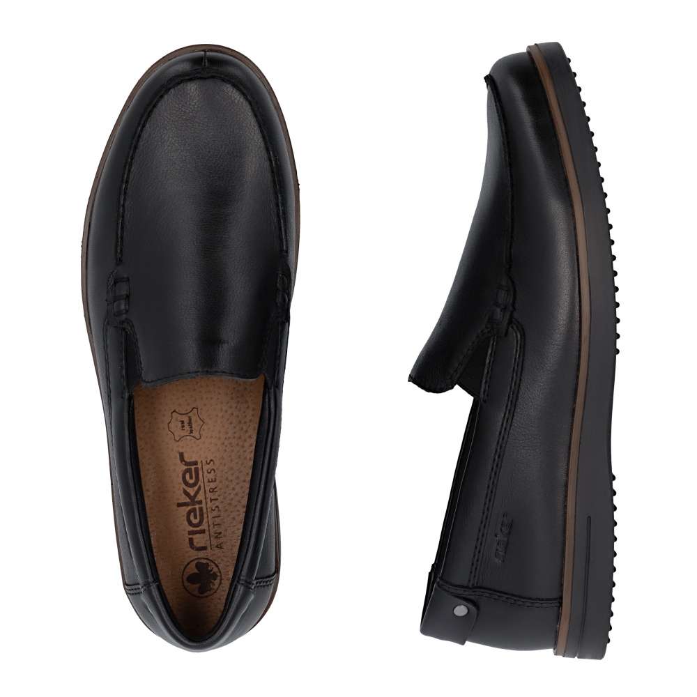 Tyto pánské mokasíny RIEKER představují dokonalou kombinaci nadčasového stylu, kvality a pohodlí, které ocení každý moderní muž. Černý svršek je doplněn liniemi prošití a decentním logem značky, které dodává mokasínům originální punc. Kožená stélka zajišťuje maximální komfort a podporu chodidla po celý den. Podrážka s tlumením nárazů a flexibilním zpracováním poskytuje pohodlný krok na různých površích a minimalizuje únavu při delším nošení. Tyto mokasíny RIEKER jsou ideální volbou pro muže, kteří oceňují klasický vzhled a kvalitu – skvěle doplní elegantní i ležérní outfit a poskytnou spolehlivé pohodlí během celého dne. Technologie: Antistress – díky čtyřem antistresovým vlastnostem – lehkosti, pružnosti, prostornosti a vynikající absorpci nárazů – vám boty RIEKER nabídnou komfortnější chůzi.