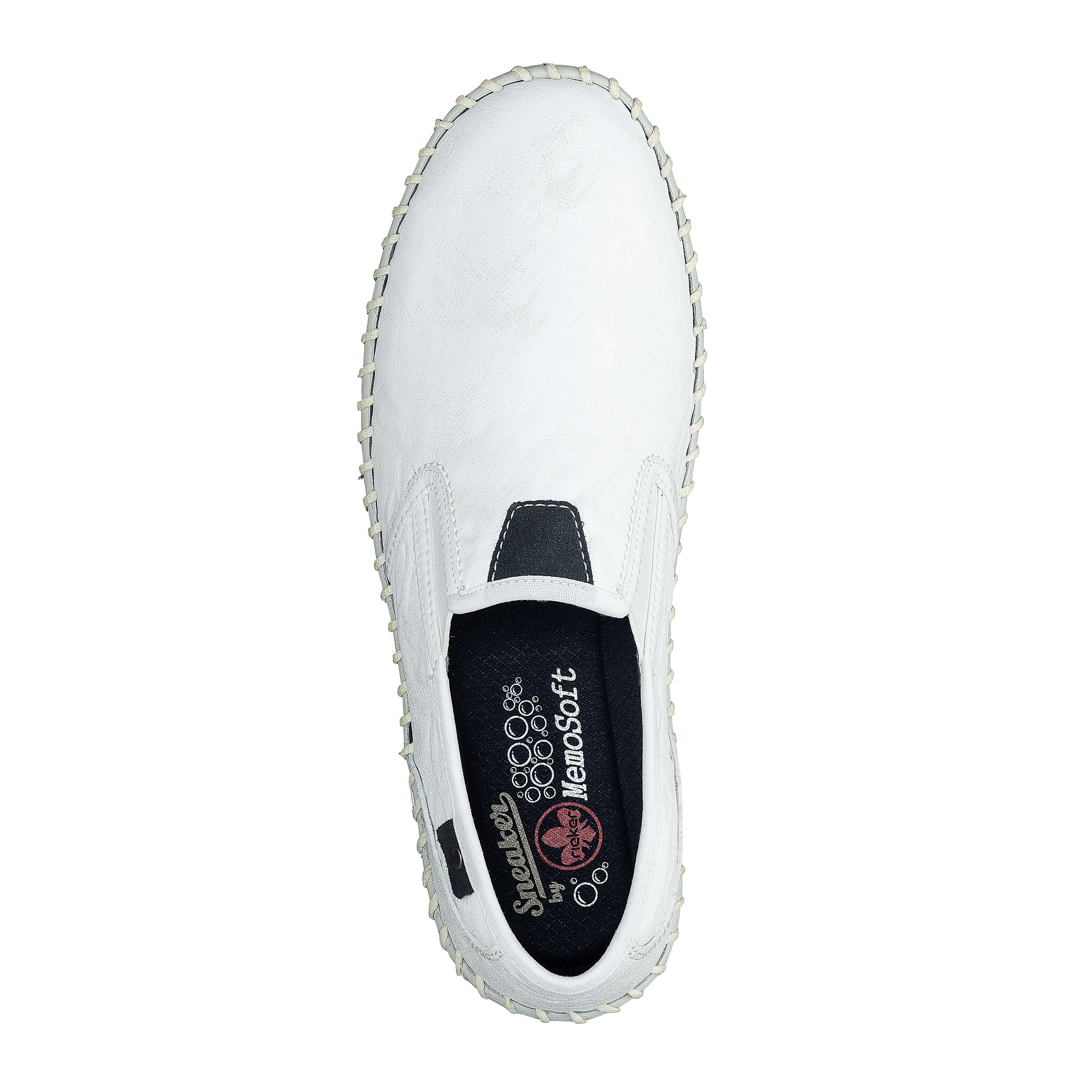Detailní informace Tyto pánské mokasíny značky RIEKER oceníte především během jarních a letních dnů, kdy Vás budou doprovázet pohodlím a moderním vzhledem. Bílý kožený svršek je lemován výrazným prošíváním po celém obvodu a logem značky RIEKER na vnější straně. Stélka s technologií MemoSoft a lehká podešev zajistí měkký došlap při každém kroku. Díky pružným gumičkám po stranách se obuv skvěle přizpůsobí Vaší noze. Tento model se skvěle hodí ke každému oblečení do práce i na procházku.
