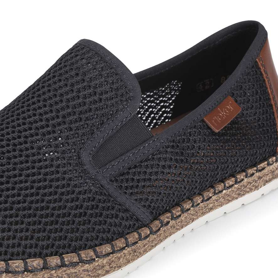 Tyto pánské mokasíny RIEKER jsou ztělesněním moderního stylu a pohodlí. Černý svršek z textilního materiálu zajišťuje prodyšnost a pohodlí, zatímco hnědé aplikace vytváří módní kontrast. Boční gumičky v části nártu umožňují snadné nazutí, takže mokasíny padnou přesně a pohodlně každé noze. Kožená stélka poskytuje měkký komfort a flexibilní podešev tlumící nárazy zajišťuje stabilitu při každém kroku – ideální do práce, na procházky nebo volnočasové aktivity. Tyto mokasíny nejsou jen praktické – jsou stylovým kouskem, který doplní každý moderní outfit a dodá muži trendový vzhled.