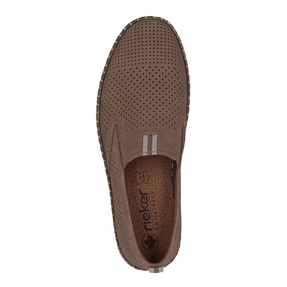 Model, který přesně vystihuje filozofii značky RIEKER – spojení komfortu, kvality a nadčasové elegance. Tyto mokasíny nejsou jen botami, ale vyjádřením sebevědomí a moderního životního stylu. Na první pohled zaujmou svým koženým svrškem s jemným perforovaným vzorem, který nejen dodává stylový vzhled, ale zároveň zajišťuje optimální prodyšnost během nošení. Nárt dekoruje jemná aplikace a díky elastickým gumičkám po stranách nártu je obouvání mimořádně jednoduché – boty se přizpůsobí tvaru vaší nohy a poskytují přirozené pohodlí bez nutnosti šněrování. Vnitřek bot tvoří měkká kožená stélka, která se přizpůsobí tvaru nohy a poskytuje ideální podporu. O pohodlný a jistý krok se stará lehká, flexibilní podrážka s tlumením nárazů, která eliminuje únavu nohou a dodává pocit lehkosti při každém kroku. Tyto mokasíny díky svému univerzálnímu stylu se hodí do kanceláře i pro běžné nošení.