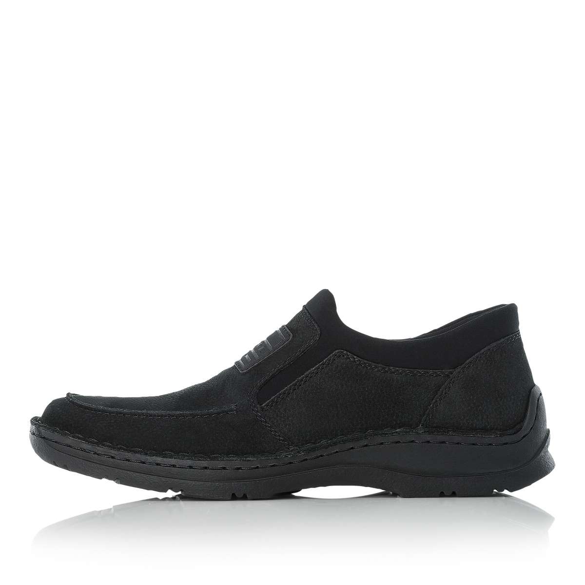 Nádherné pánské mokasíny černé barvy jsou šité z pravé kůže. Elegantní šití, znak Rieker na nártu, hrubší vzhled, šev kolem špice s robustnější podešví jsou zdobnými prvky tohoto modelu. Kolem kotníku je našit pružný materiál, který slouží pro snažší obutí a vyzutí. Velmi praktická bota vhodná ke všem příležitostem.