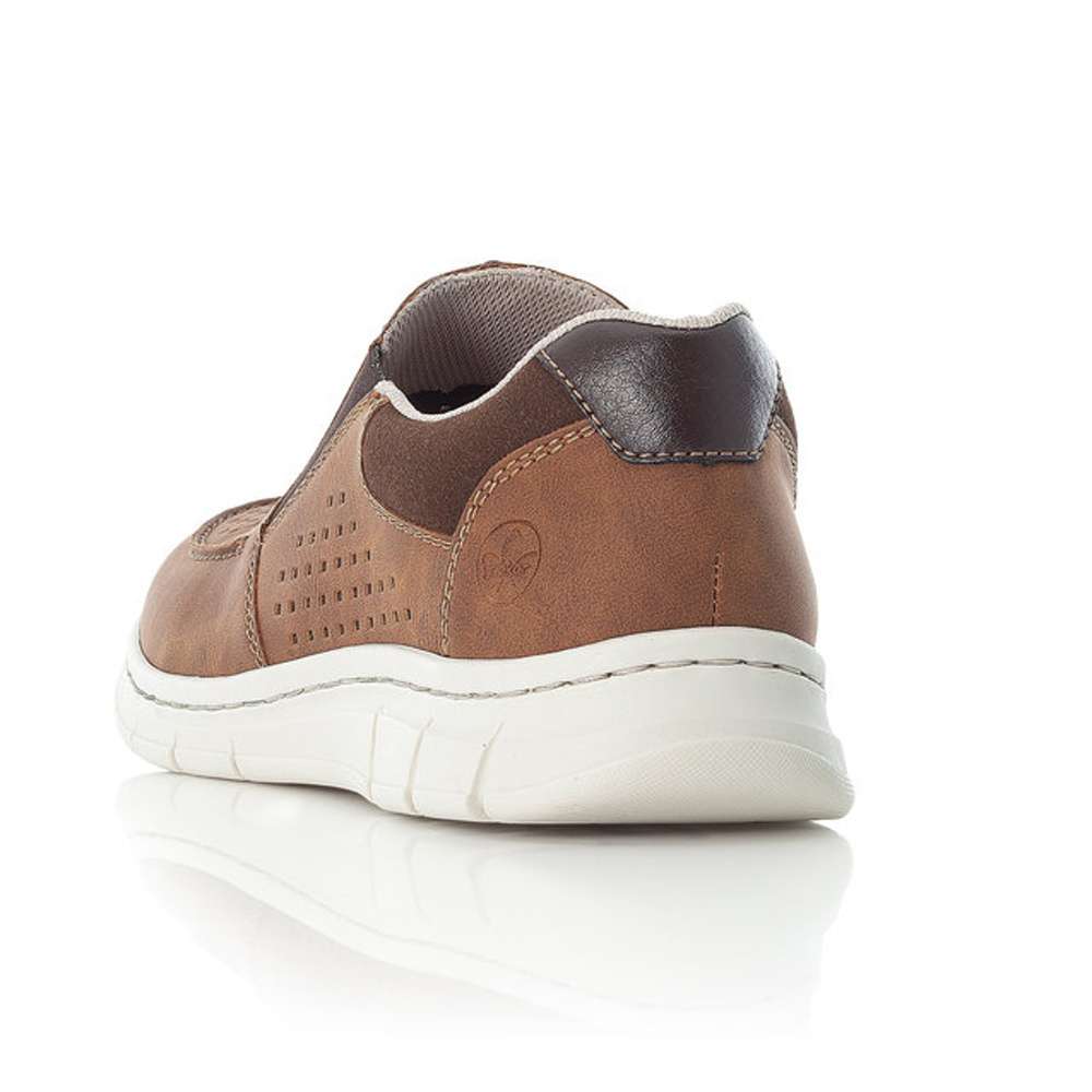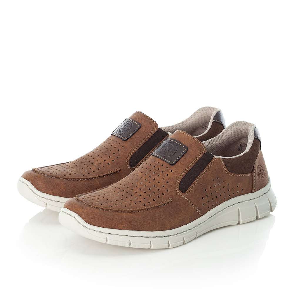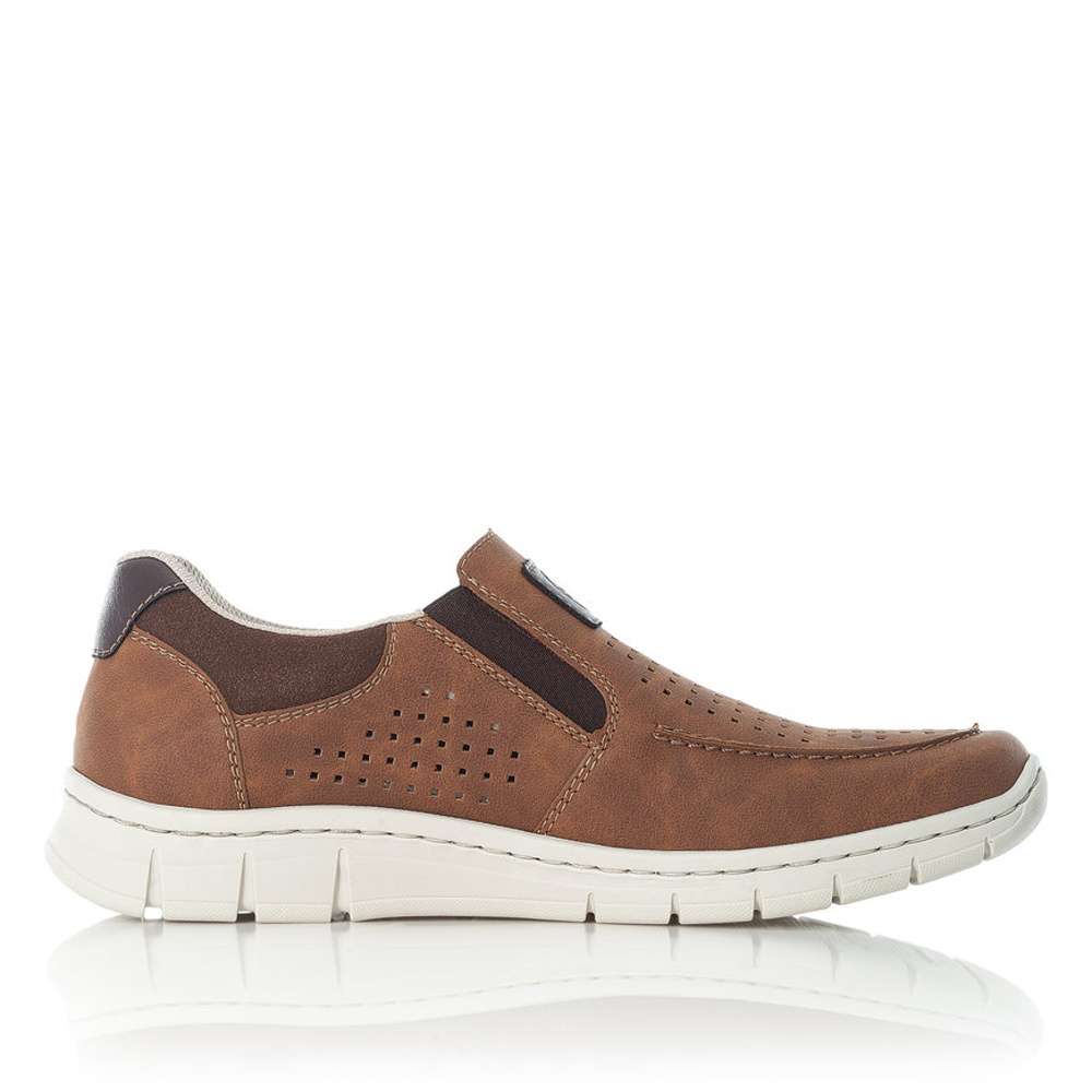 Tato pánská polobotka značky RIEKER Vás na první pohled zaujme barevnou kombinací hnědé a tmavě hnědých doplňků.