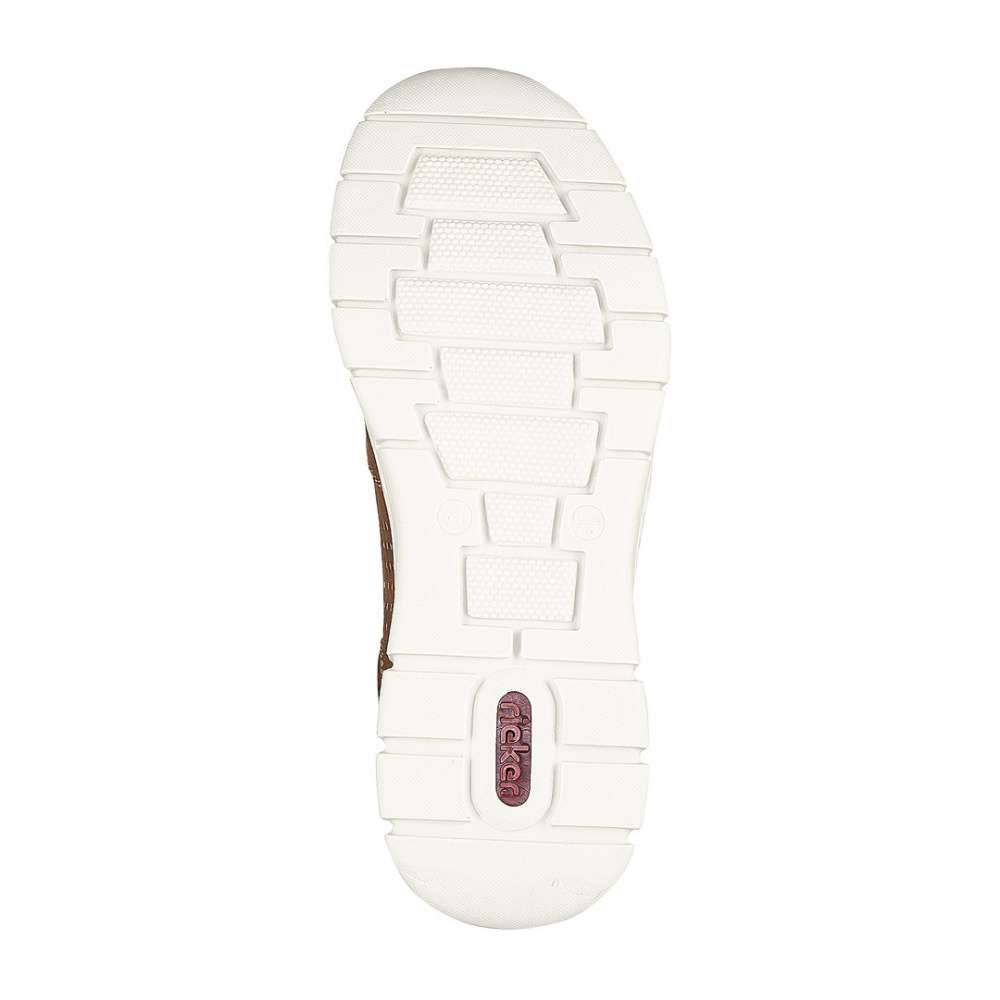 Svršek je perforován a prošit kontrastní nití. Lehká, flexibilní podešev s technologií Antistress je se svrškem spojena jemným prošíváním, které je pro značku RIEKER typické. Pro snadné nazouvání slouží pružné gumičky po stranách.