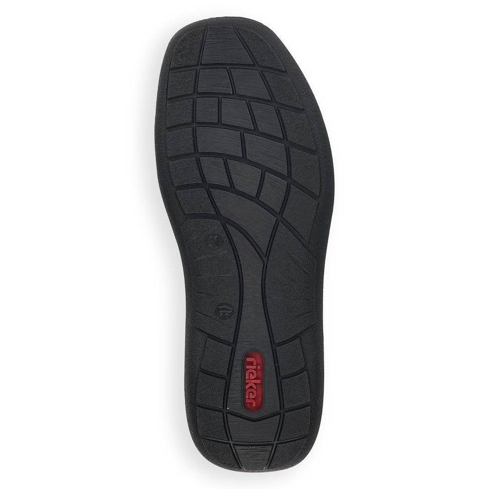 Jednoduchost je heslo, kterým se řídili návrháři při vytváření tohoto modelu značky RIEKER. Hladký kožený svršek je zdobený vytlačeným logem značky, prošíváním, nášivkou na nártu a povrchovou perforací na špičce obuvi. Pro snadné nazouvání slouží všité pružné gumičky po stranách obuvi a měkká kožená stélka se postará o potřebný komfort. Podešev je se svrškem spojena prošitím, které je pro tuto značku typické. Tyto mokasíny snadno sladíte s kalhotami ať už do práce, či na procházku s přítelkyní. Technologie: Antistress – podešev je díky této technologii lehká, flexibilní, absorbuje nárazy při došlapu a snadno se přizpůsobí každé noze.