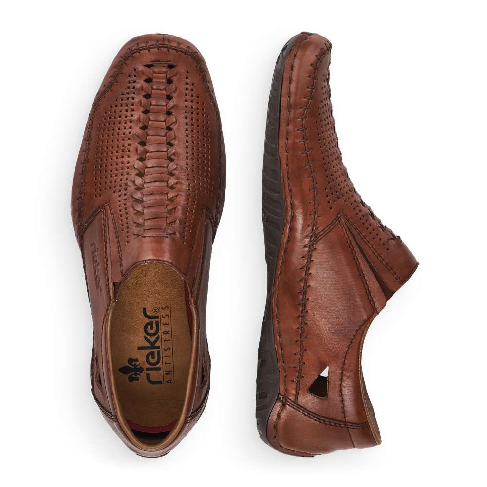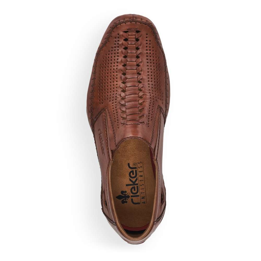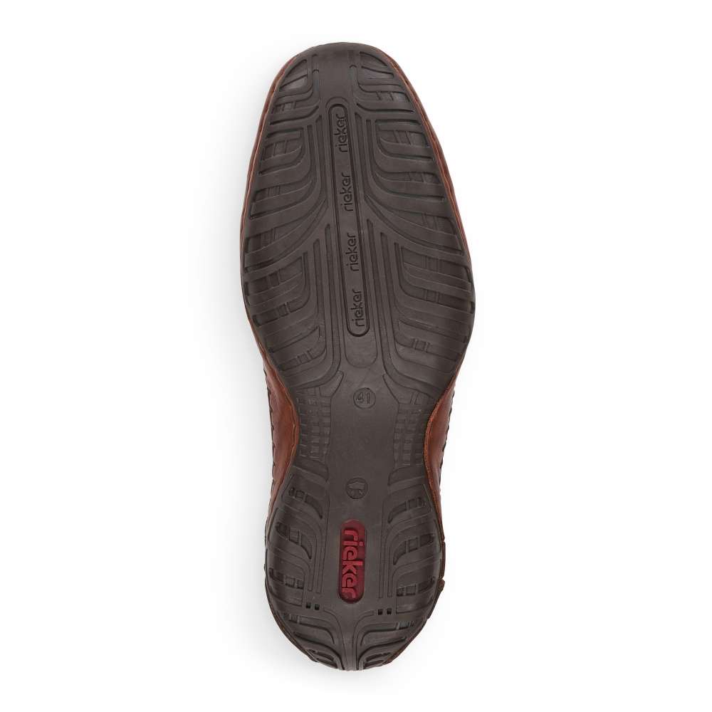 Pánské polobotky značky RIEKER Vás upoutají na první pohled. Kožený svršek zdobný proplétaným vzorem na nártu, prošíváním a vytlačeným logem značky je pro snadnější odvětrávání vybaven perforací. Měkká stélka je pro Vaše pohodlí vyjímatelná a nízká podešev je se svrškem spojena šitím, což je pro tuto značku typické.Tato obuv bude dobře vypadat jak k plátěným kalhotám, tak ke kraťasům. Technologie: Antistress – podešev je díky této technologii lehká, flexibilní, absorbuje nárazy při došlapu a snadno se přizpůsobí každé noze. Tato bota je vybavena vyjímatelnou stélkou.