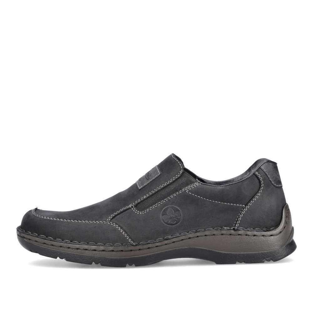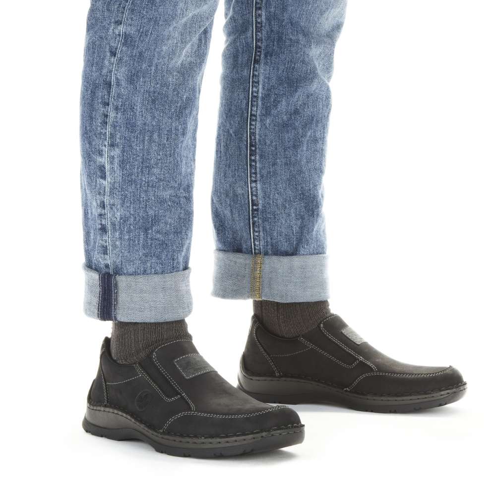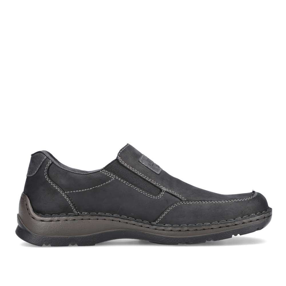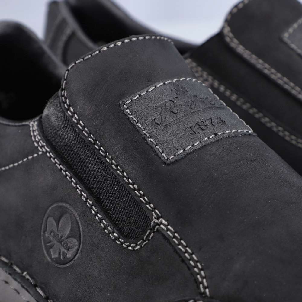 Pánské mokasíny značky RIEKER, které Vás dostanou svou jednoduchostí na první pohled. Černý jemně broušený svršek je vyroben z pravé kůže a je doplněn o kontrastní prošívání, nášivku na nártu a vytlačené logo značky. Po stranách jsou vsazeny pružné gumičky, které můžete využít při obutí a vyzutí. Pohodlí na každém kroku zajistí měkká kožená stélka a příjemně vysoká podešev je se svrškem spojena šitím, které je pro tuto značku typické a činí tak obuv lehkou a flexibilnější. Velmi praktická bota vhodná ke všem Vašim příležitostem, kdy se budete vždy cítit skvěle. Technologie: Antistress – podešev je díky této technologii lehká, flexibilní, absorbuje nárazy při došlapu a snadno se přizpůsobí každé noze.