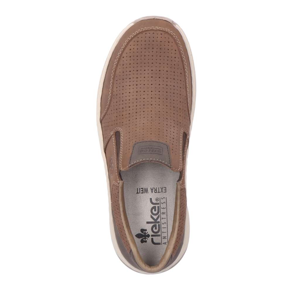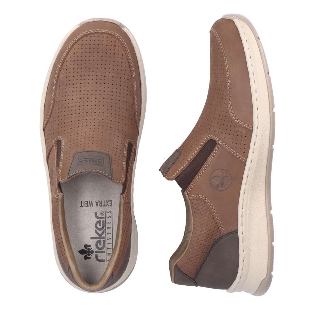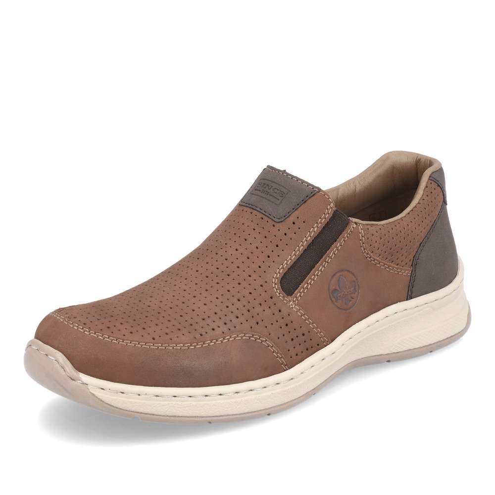 Pohodlné pánské mokasíny od značky RIEKER mají svršek z přírodní usně v hnědé barvě. Obuv je zdobena perforací, která zajistí lepší odvětrávání, jemným prošíváním a kontrastní podešví. Tuto obuv si oblíbíte díky měkké stélce, která Vám zajistí komfort při nošení a lze ji i snadno vyjmout a vyvětrat. Pružné gumičky Vám umožní snadné a rychlé obutí a šitá podešev je vyrobena s technologií Antistress pro měkký došlap. Tento model je vhodný do práce i výlet s přáteli. Technologie: Antistress – podešev je díky této technologii lehká, flexibilní, absorbuje nárazy při došlapu a snadno se přizpůsobí každé noze.