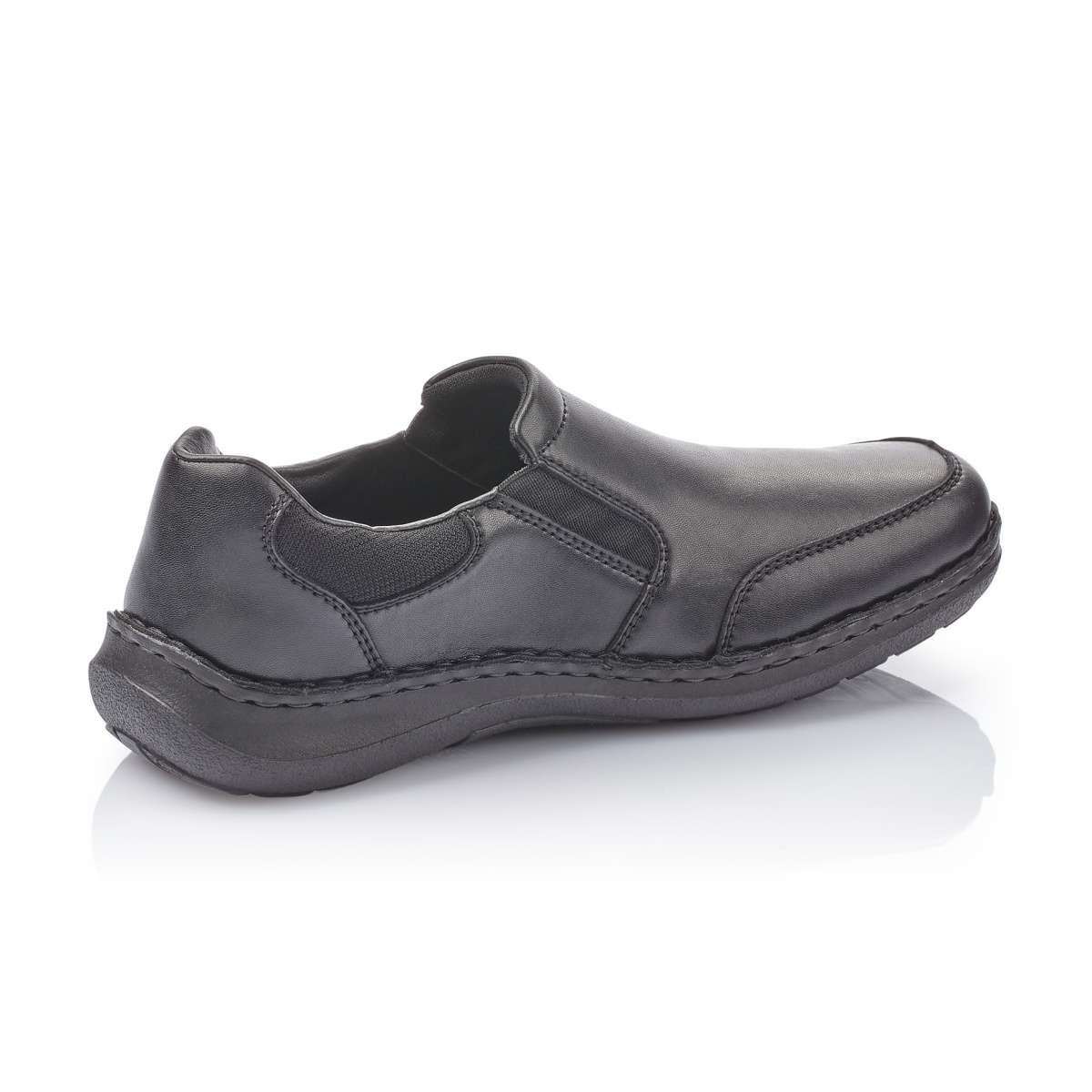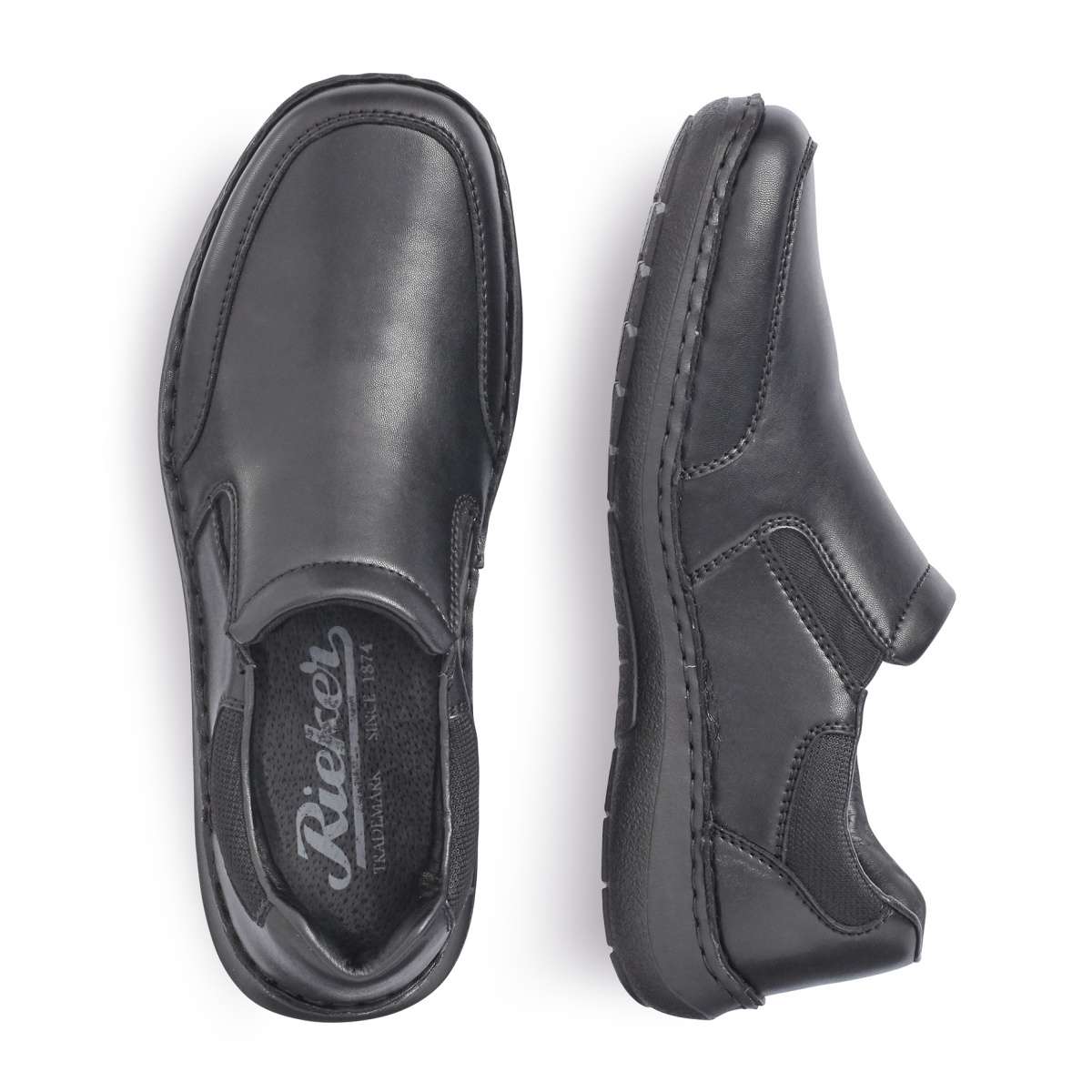 Módní pánská obuv značky Rieker černé barvy je ozdobena výrazným prošitím a má hladký povrch, což dodává botě velkou eleganci. V oblasti nártu jsou také vsazené gumičky, které usnadňují obouvání. Tento elegantní model unosíte ke všem outfitům a jakékoliv příležitosti.