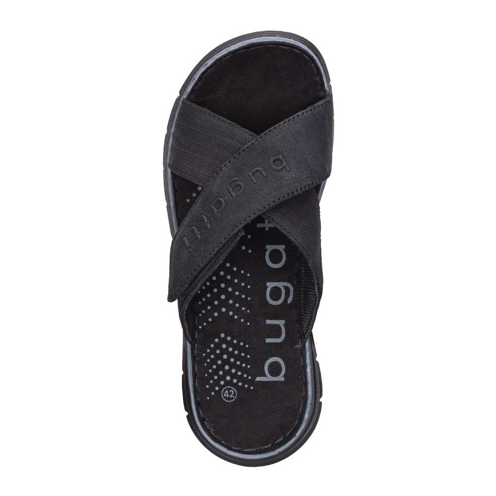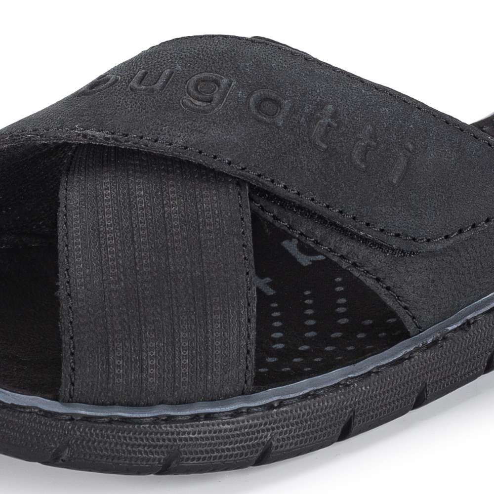 Originální pánské pantofle značky BUGATTI, Vás zaujmou na první pohled. Kožený svršek je doplněný logem značky. Pro snadné obutí slouží suchý zip a gumička na páscích, a tak si botky uzpůsobíte dle svých představ. Měkká stélka a jemná podšívka zajistí pohodlí po celý den. Tento model bude každodenním parťákem na letní slunečné dny i večery.
