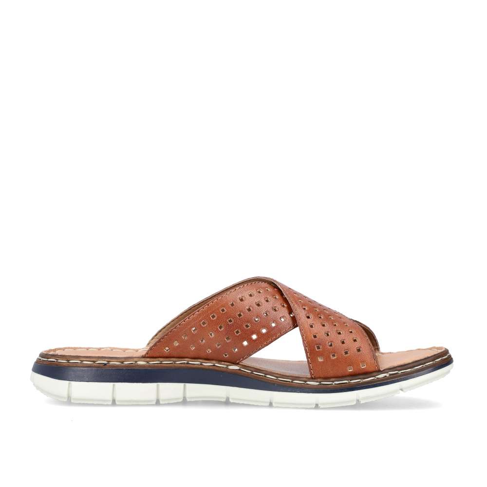 Tento elegantní, městský model nazouváků vznikl v dílně návrhářů pro značku RIEKER. Kožený svršek světle hnědé barvy je zdobný perforací překřížených nártových pásků a nášivkou s názvem značky. Pohodlí zajistí měkká stélka a celkový vzhled k dokonalosti doladí kontrastní podešev. Ať už si oblečete kalhoty či kraťasy budete vypadat naprosto excelentně. Technologie: Antistress – podešev je díky této technologii lehká, flexibilní, absorbuje nárazy při došlapu a snadno se přizpůsobí každé noze.