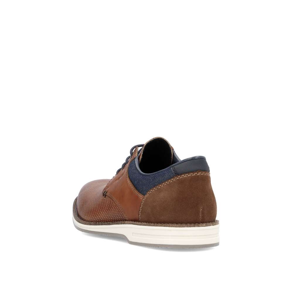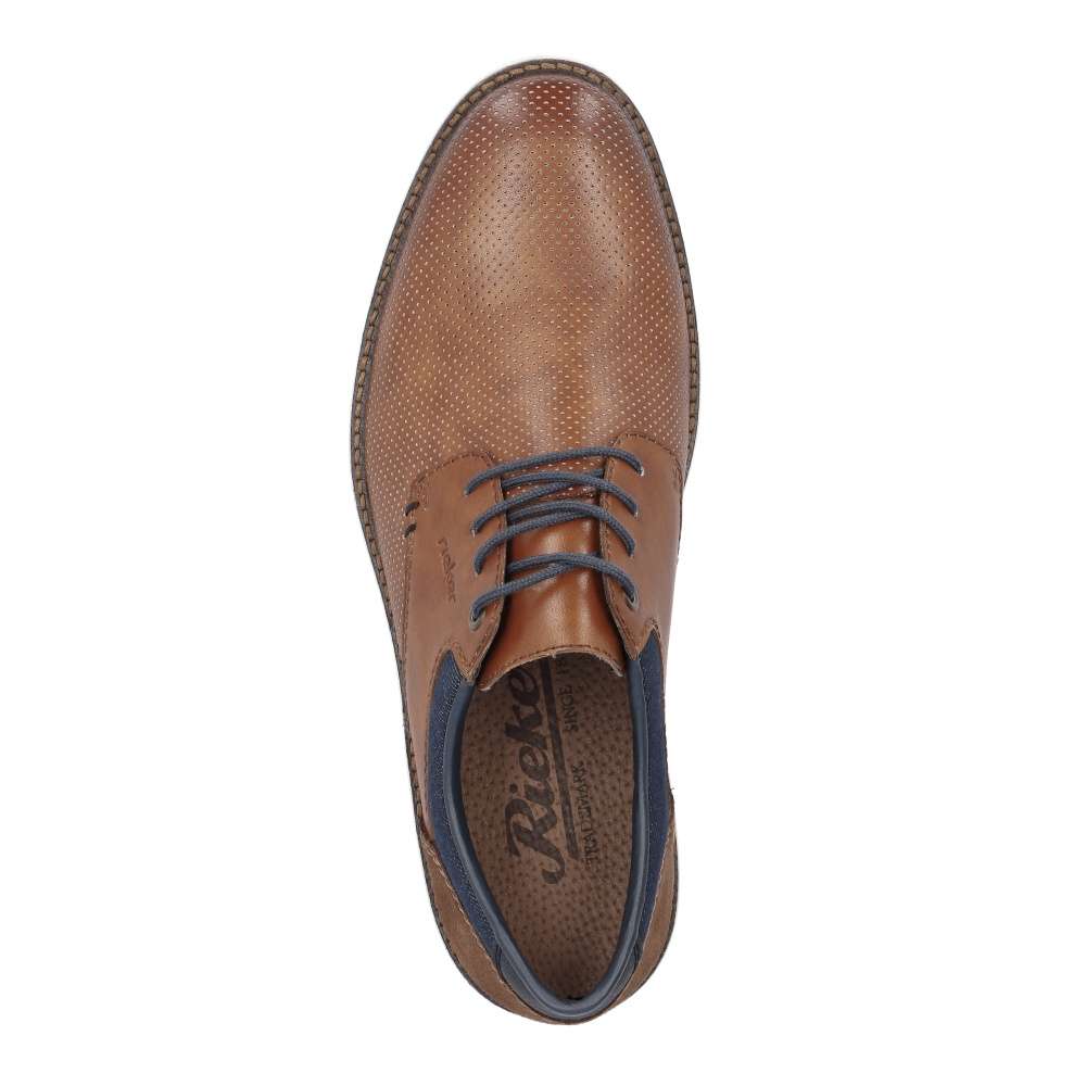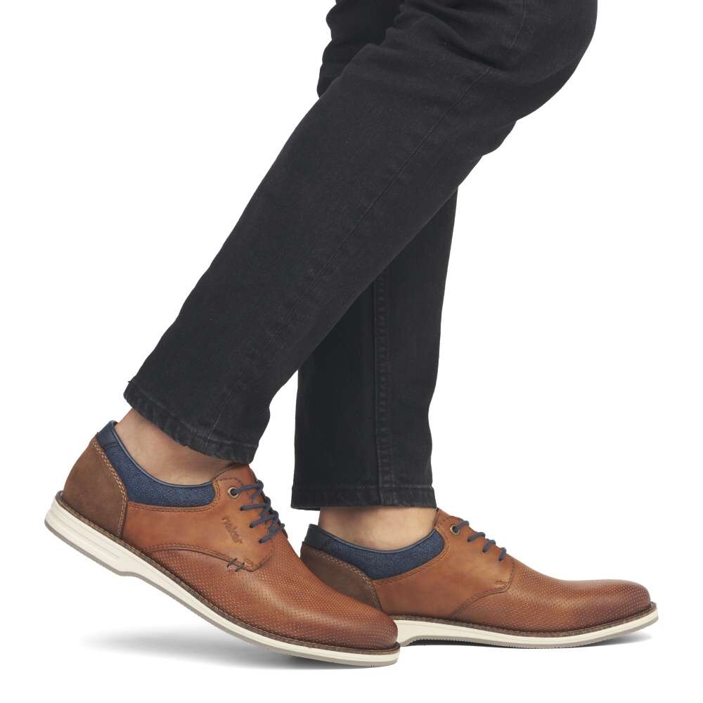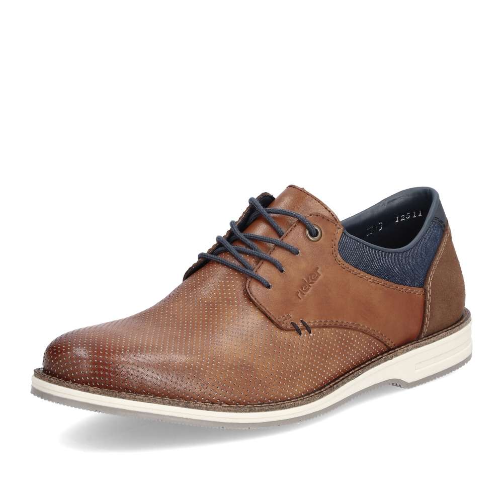 Šněrovací pánské polobotky značky RIEKER vhodné na každodenní nošení. Svršek je v přední části povrchově perforován a ozdoben prošíváním, vytlačeným nápisem a modrými riflovými částmi. Snadno si obuv nazujete a přizpůsobíte dle požadavků díky šněrování. Stélka je pro Vaše pohodlí vyrobena z měkkého materiálu a kvalitní podešev je ozvláštněna světle hnědým proužkem kolem celého obvodu. Tyto boty můžete nosit jak do města, tak do kanceláře. Technologie: Antistress – podešev je díky této technologii lehká, flexibilní, absorbuje nárazy při došlapu a snadno se přizpůsobí každé noze.