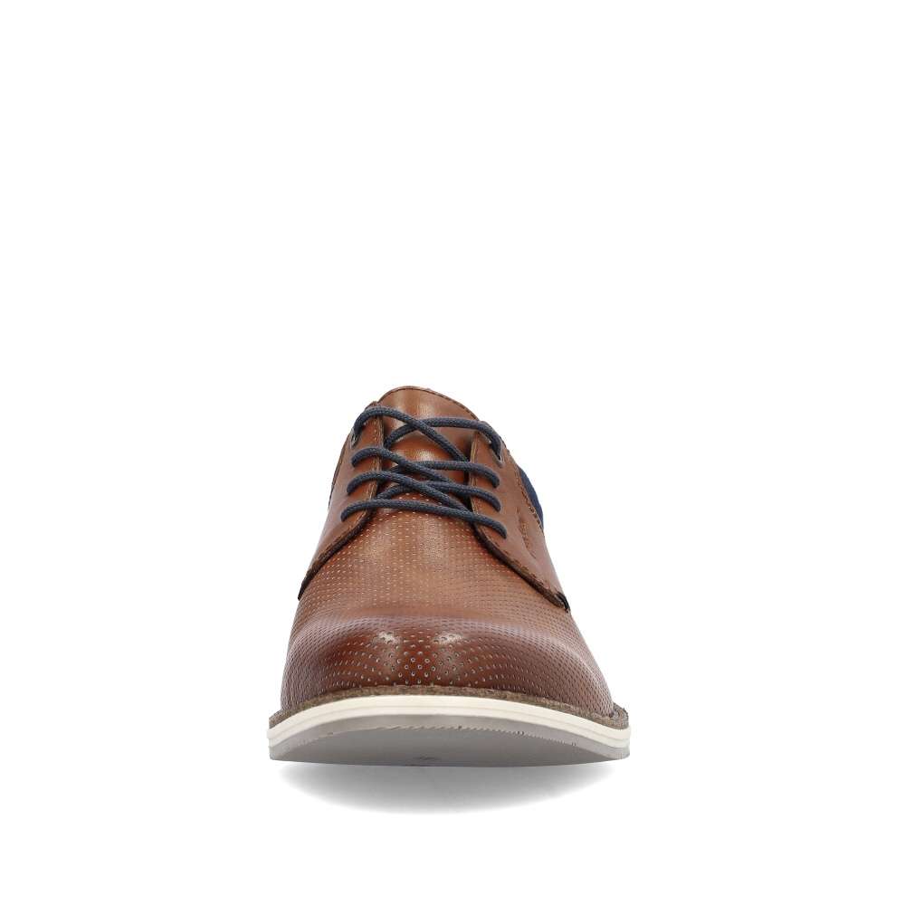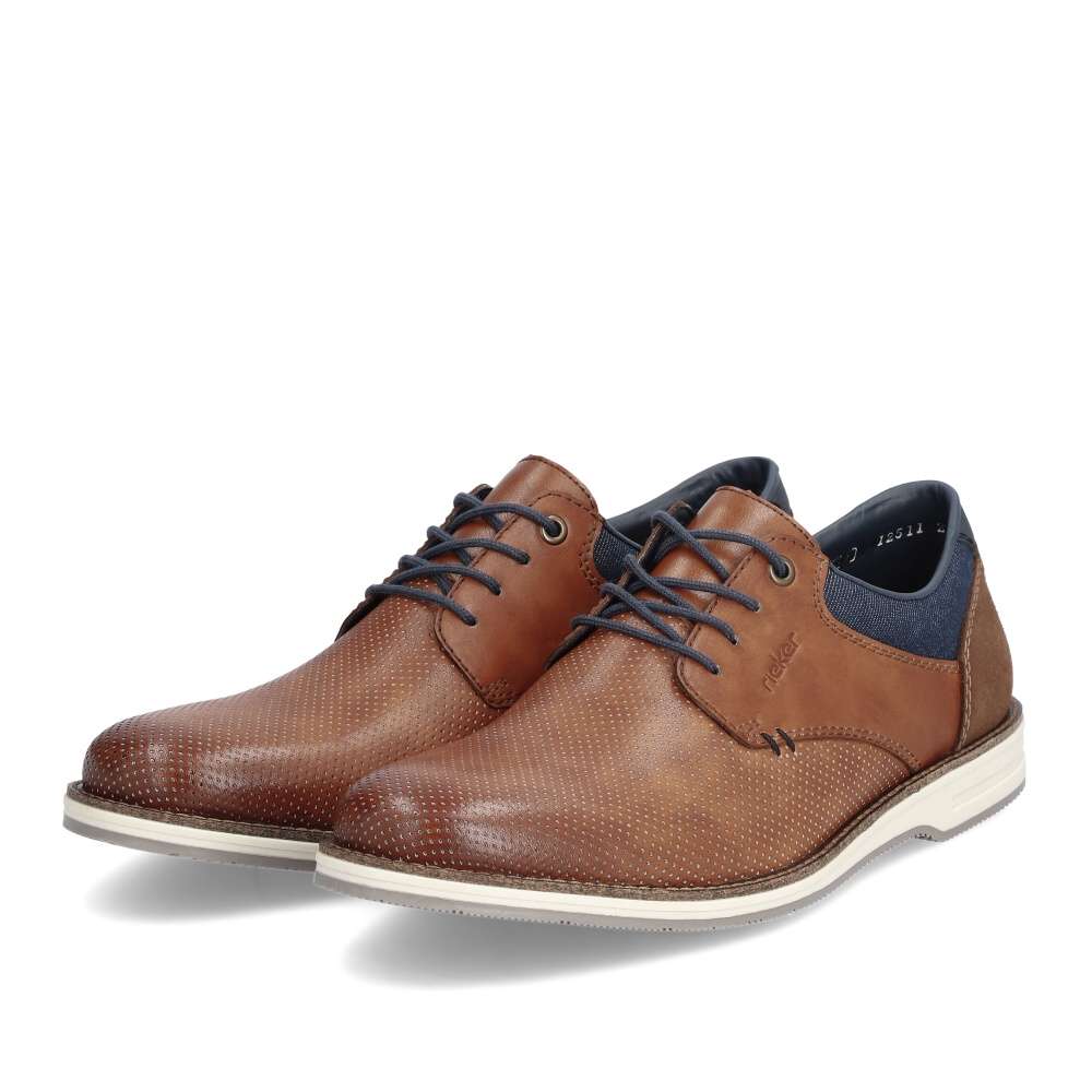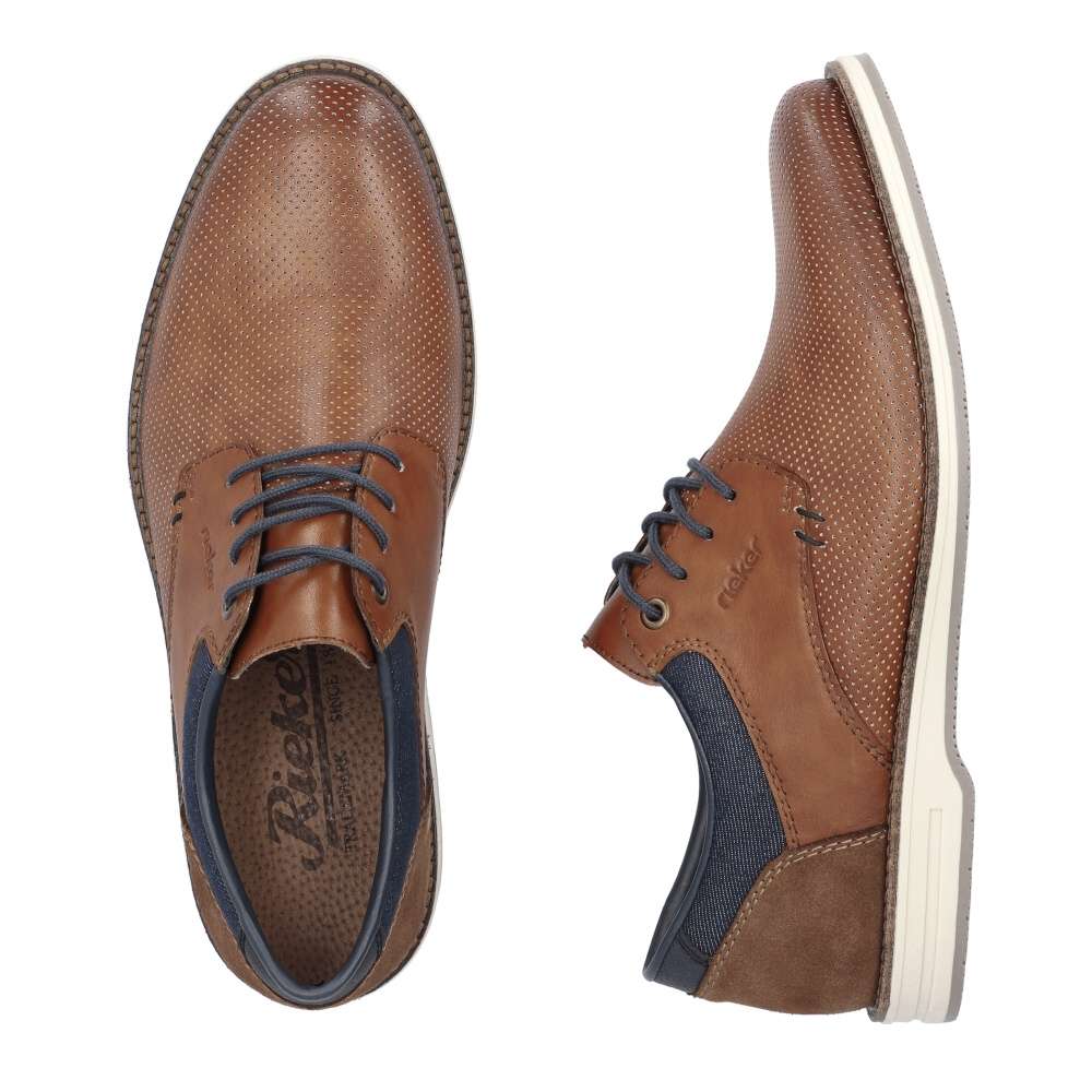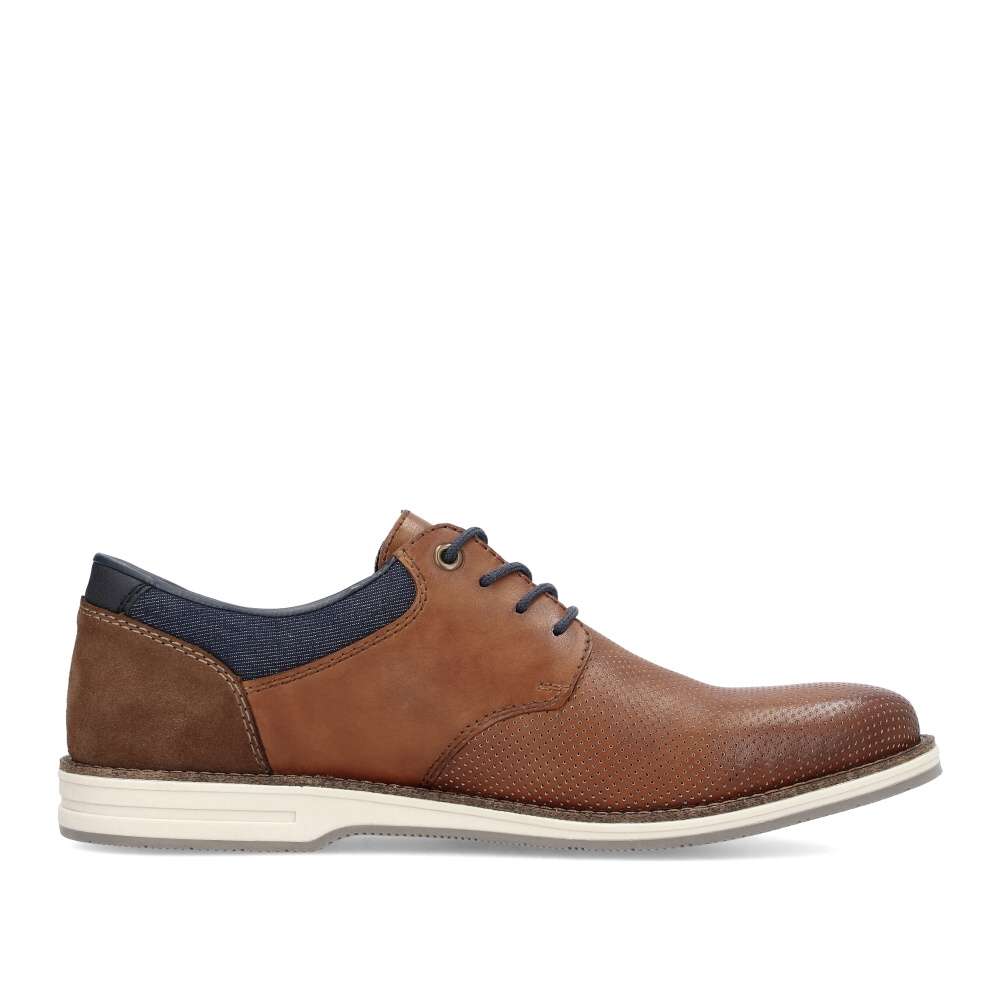 Šněrovací pánské polobotky značky RIEKER vhodné na každodenní nošení. Svršek je v přední části povrchově perforován a ozdoben prošíváním, vytlačeným nápisem a modrými riflovými částmi. Snadno si obuv nazujete a přizpůsobíte dle požadavků díky šněrování. Stélka je pro Vaše pohodlí vyrobena z měkkého materiálu a kvalitní podešev je ozvláštněna světle hnědým proužkem kolem celého obvodu. Tyto boty můžete nosit jak do města, tak do kanceláře. Technologie: Antistress – podešev je díky této technologii lehká, flexibilní, absorbuje nárazy při došlapu a snadno se přizpůsobí každé noze.