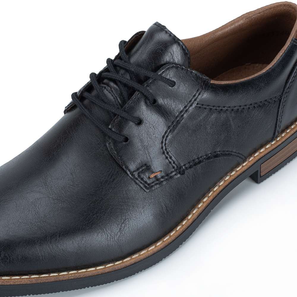 Detailní informace Šněrovací pánské polobotky značky RIEKER jsou ideální volbou pro muže, kteří hledají spojení elegantního vzhledu, pohodlí a univerzálního využití. Hladký černý svršek působí nadčasově a díky svému čistému designu se skvěle hodí pro každodenní nošení. Jemné prošívání dodává obuvi strukturu a za patou je doplněno kontrastním detailem v jiné barvě, který botám dodává stylový akcent. Šněrování umožňuje ideální přizpůsobení noze a zajišťuje pohodlné nošení po celý den. Flexibilní podešev v typickém módním stylu značky RIEKER podporuje přirozený pohyb chodidla, tlumí nárazy při chůzi a přispívá k celkovému komfortu. Tyto polobotky jsou mimořádně univerzální – můžete je nosit do města, do práce i do kanceláře. Praktický a elegantní model, který se rychle stane nedílnou součástí vašeho šatníku.
