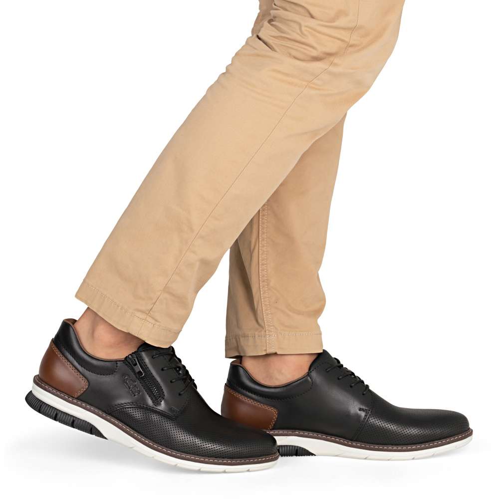 Tyto pánské polobotky RIEKER představují nadčasovou klasiku v moderním provedení, která by rozhodně neměla chybět v žádném šatníku stylového muže. Jejich svršek v černém odstínu působí sofistikovaně, zatímco minimalistický vzor a barevně kontrastní prvek v zadní části zvýrazní jedinečný charakter tohoto modelu. Klasické šněrování a zip v části nártu umožňují snadné a rychlé obouvání, přičemž se bota dokonale přizpůsobí tvaru nohy, aby vám poskytla stabilitu a jistotu při každém kroku. Vnitřní kožená stélka přináší vyjímečné pohodlí, díky kterému se budete cítit komfortně i při celodenním nošení. Flexibilní podešev s tlumícím efektem absorbuje nárazy při chůzi, čímž odlehčuje klouby a přispívá k ještě vyššímu komfortu. Navíc svým propracovaným vzhledem zvýrazní osobitost tohoto modelu. Tyto polobotky RIEKER jsou ideální volbou pro každou příležitost - ať už jde o pracovní den v kanceláři nebo volnější outfit do města. Technologie: Antistress – díky čtyřem antistresovým vlastnostem – lehkosti, pružnosti, prostornosti a vynikající absorpci nárazů – vám boty RIEKER nabídnou komfortnější chůzi.