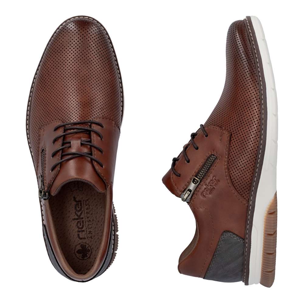 Tyto pánské polobotky RIEKER představují nadčasovou klasiku v moderním provedení, která by rozhodně neměla chybět v žádném šatníku stylového muže. Jejich svršek v hnědém odstínu působí sofistikovaně, zatímco minimalistický vzor a barevně kontrastní prvek v zadní části zvýrazní jedinečný charakter tohoto modelu. Klasické šněrování a zip v části nártu umožňují snadné a rychlé obouvání, přičemž se bota dokonale přizpůsobí tvaru nohy, aby vám poskytla stabilitu a jistotu při každém kroku. Vnitřní kožená stélka přináší vyjímečné pohodlí, díky kterému se budete cítit komfortně i při celodenním nošení. Flexibilní podešev s tlumícím efektem absorbuje nárazy při chůzi, čímž odlehčuje klouby a přispívá k ještě vyššímu komfortu. Navíc svým propracovaným vzhledem zvýrazní osobitost tohoto modelu. Tyto polobotky RIEKER jsou ideální volbou pro každou příležitost - ať už jde o pracovní den v kanceláři nebo volnější outfit do města. Technologie: Antistress – díky čtyřem antistresovým vlastnostem – lehkosti, pružnosti, prostornosti a vynikající absorpci nárazů – vám boty RIEKER nabídnou komfortnější chůzi.