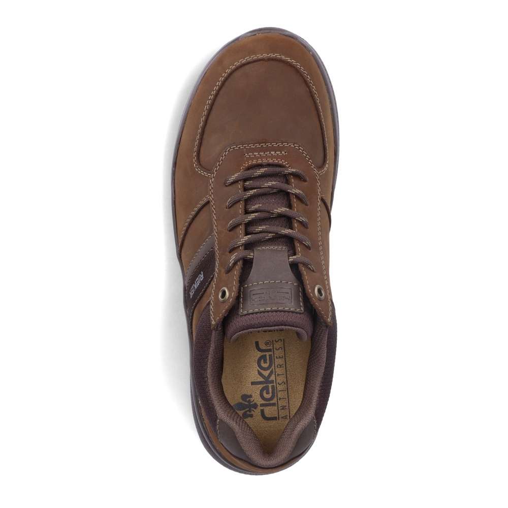 Tato pánská teniska od značky RIEKER v hnědé barvě je vyrobená převážně z přírodní usně. Výrazné dvojité prošití světlou nití je doplňující stylový prvek. Ke snadnému nazutí poslouží tkaničky na šněrování, díky kterým si boty lehce přizpůsobíte na své chodidlo. Měkká vyjímatelná stélka Vám zaručí pohodlí po celý den. Neváhejte a doplňte si botník tímto vkusným modelem. Technologie: Antistress – podešev je díky této technologii lehká, flexibilní, absorbuje nárazy při došlapu a snadno se přizpůsobí každé noze. Tato bota je vybavena vyjímatelnou stélkou.