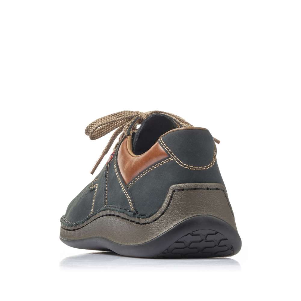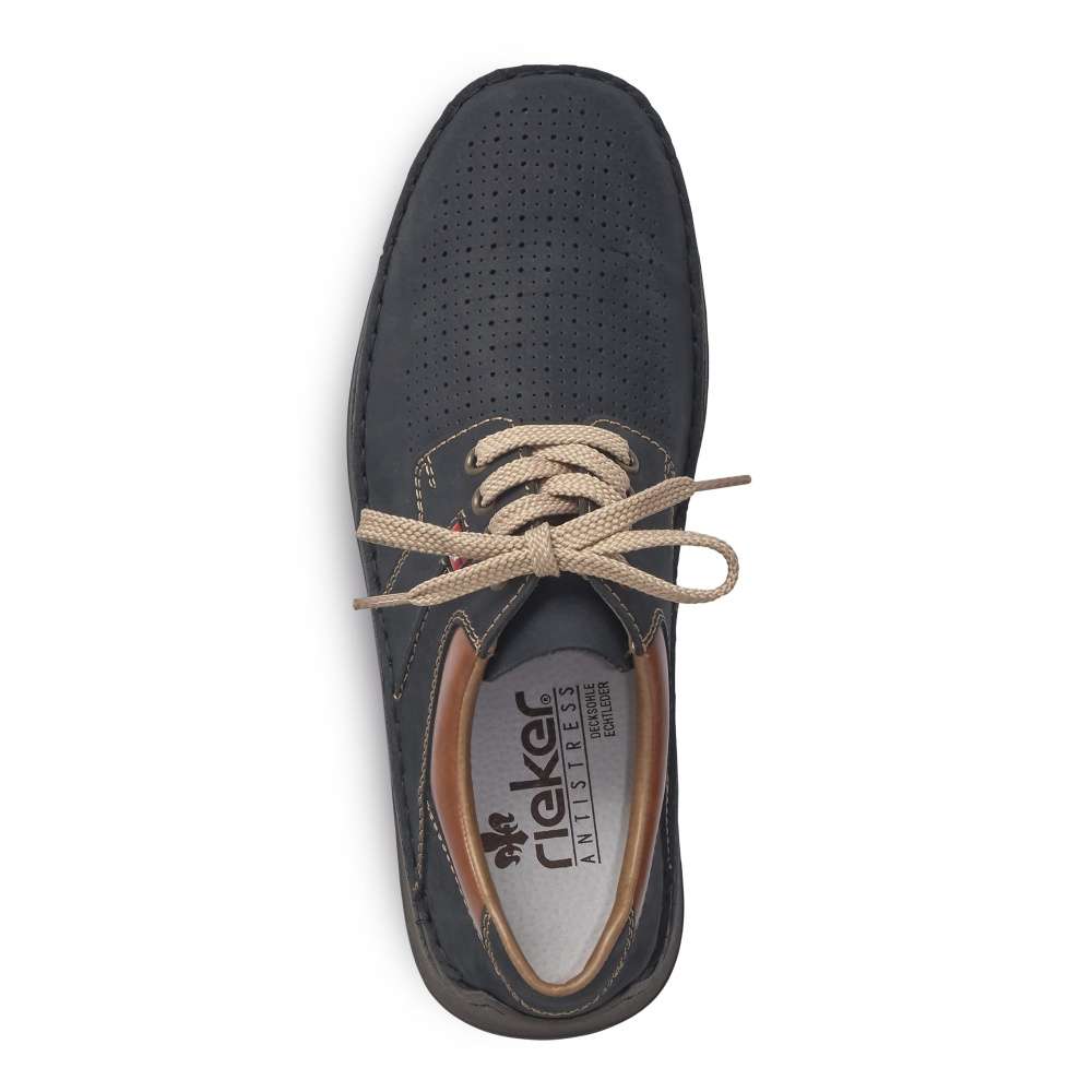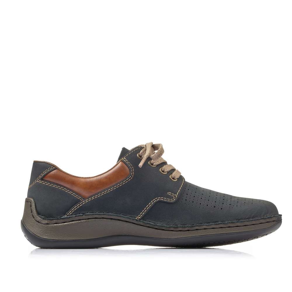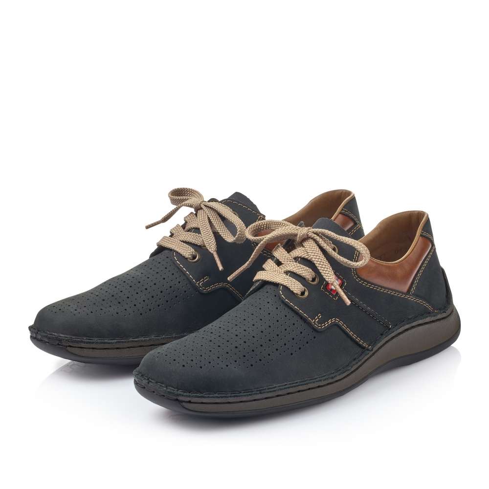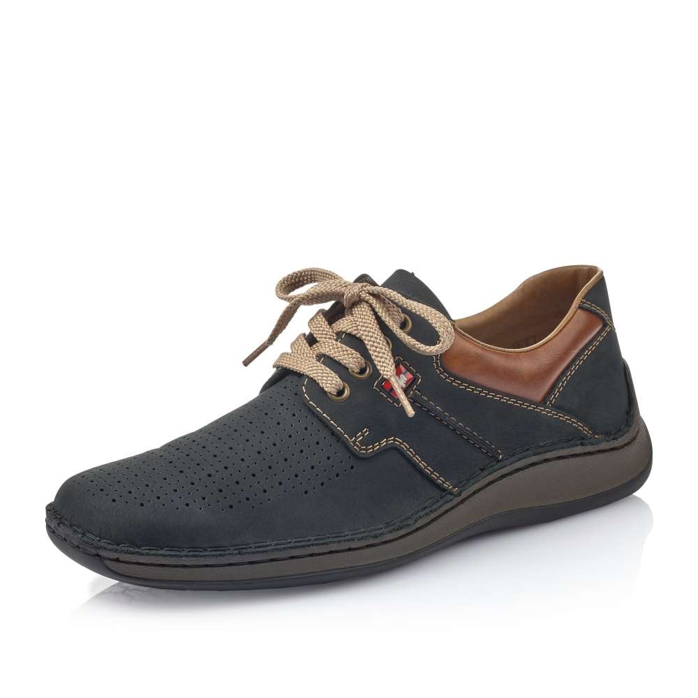 Pánské kožené perforované polobotky značky RIEKER modré barvy pro moderního muže ve sportovně elegantním provedení. Zdobným prvkem je lem hnědé barvy kolem kotníku a šněrování, kterým si ulehčíte nazouvání. Kožená stélka vytváří dostatečný prostor pro širší chodidlo a technologie Antistress v podešvi zaručí maximální pohodlí při chůzi. Ideální obuv na procházku s rodinou nebo do práce. Technologie: Antistress – podešev je díky této technologii lehká, flexibilní, absorbuje nárazy při došlapu a snadno se přizpůsobí každé noze.
