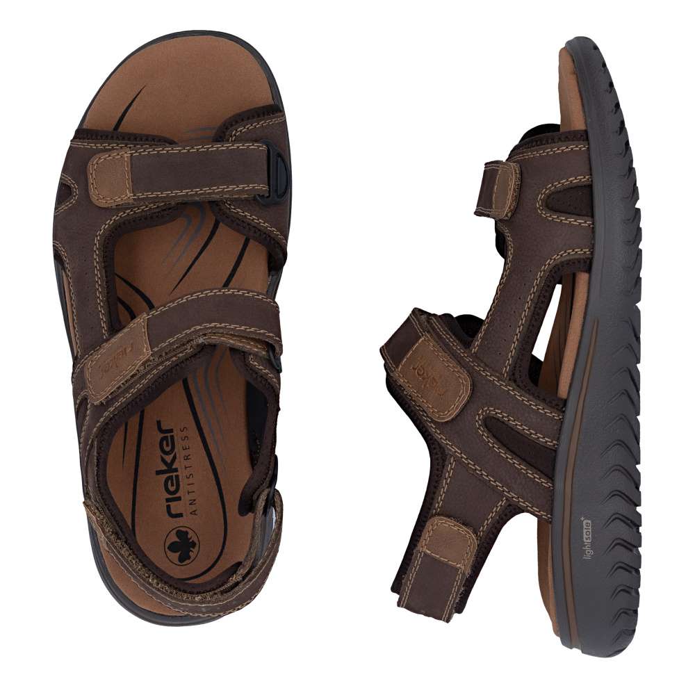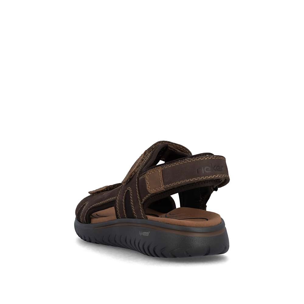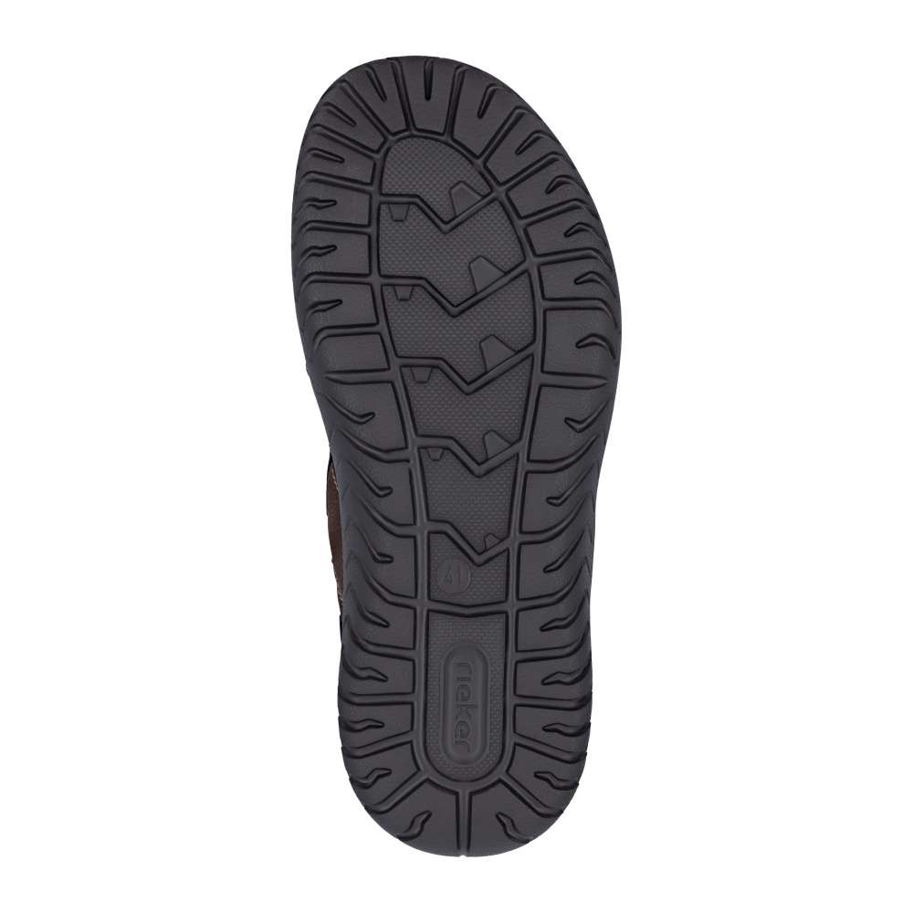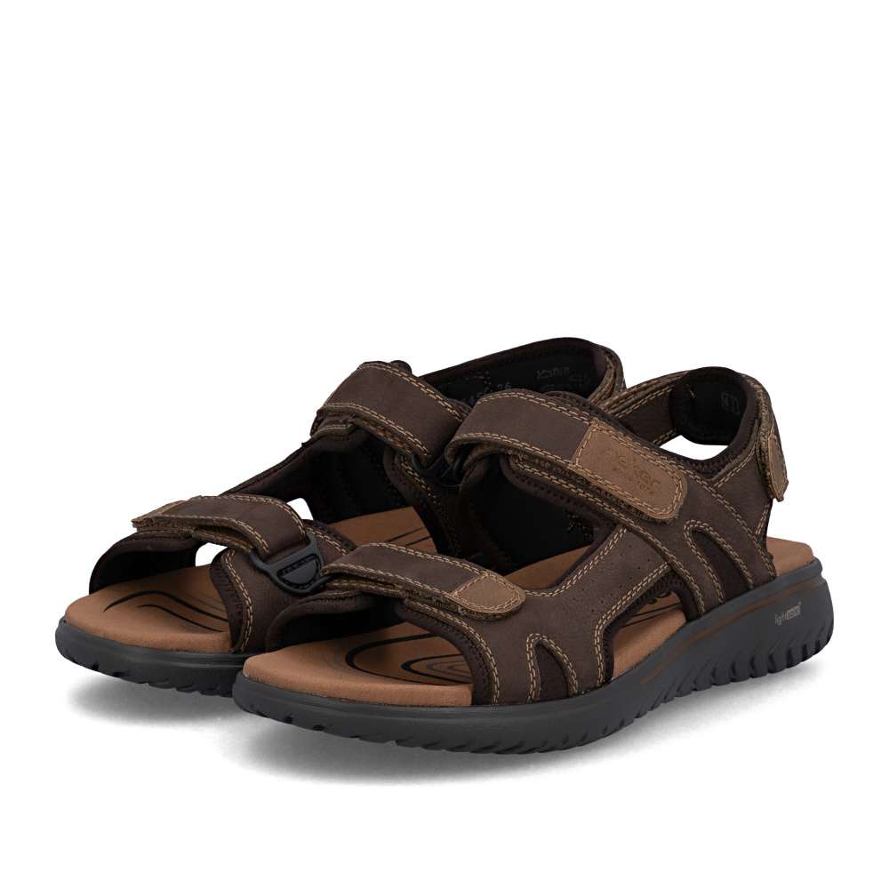 Pánské sandály RIEKER jsou ideální volbou pro muže, kteří hledají spojení pohodlí, kvality a nadčasového stylu. Hnědý kožený svršek je tvořen třemi pásky se suchým zipem – dva pásky přes nárt umožňují individuální nastavení šířky a dokonalé přizpůsobení chodidlu, zatímco zadní pásek usnadňuje nazutí a zajišťuje stabilní upevnění nohy. Textilní stélka je navržena tak, aby poskytovala příjemný pocit při kontaktu s chodidlem a podporovala pohodlnou chůzi po celý den. Podešev tlumící nárazy efektivně snižuje tlak při došlapu a absorbuje nárazy při pohybu, čímž přispívá k komfortu i při delším nošení. Pánské sandály RIEKER jsou skvělou volbou pro každodenní nošení, do práce, na procházky nebo na dovolenou.