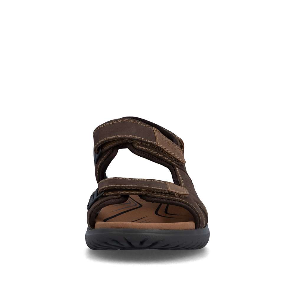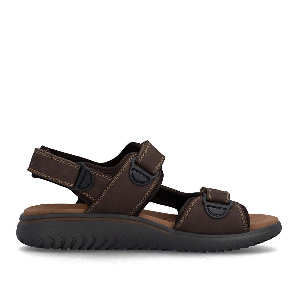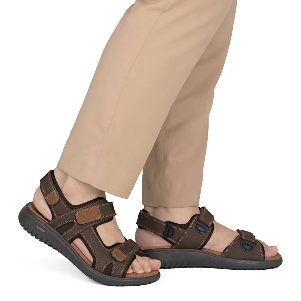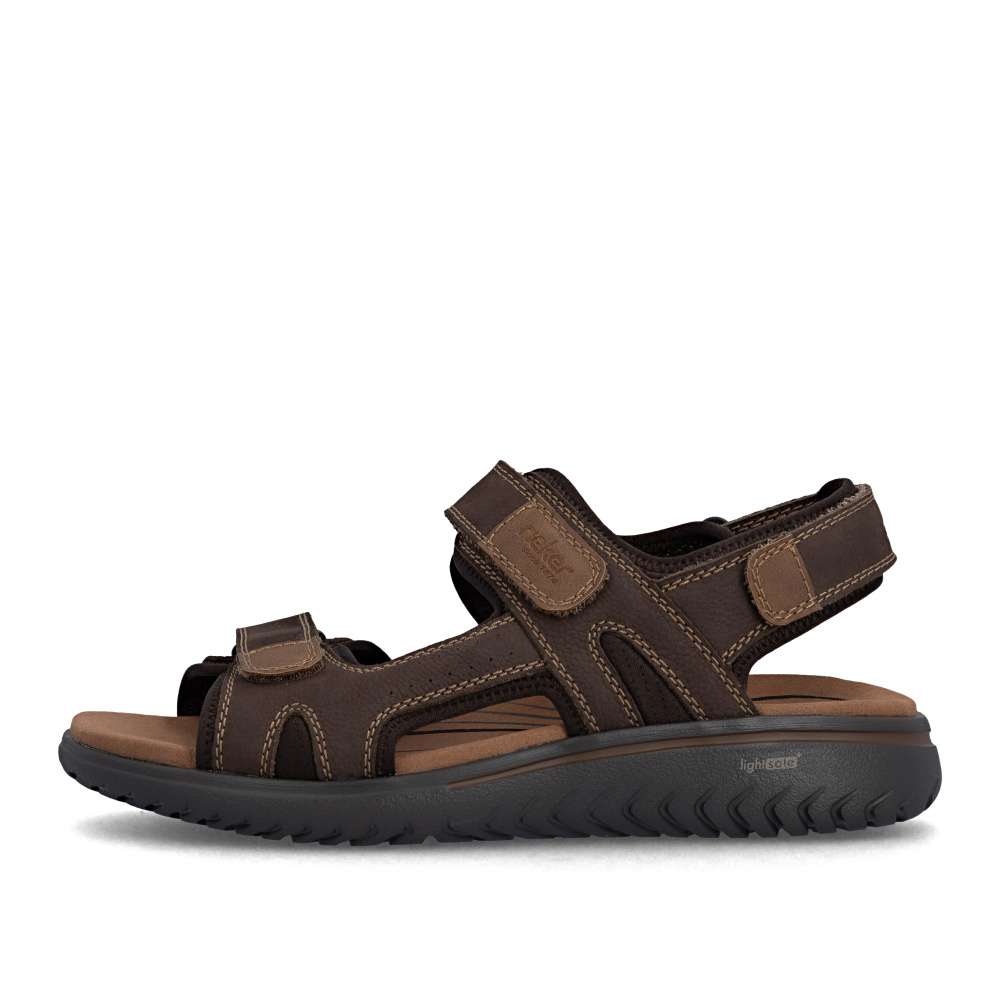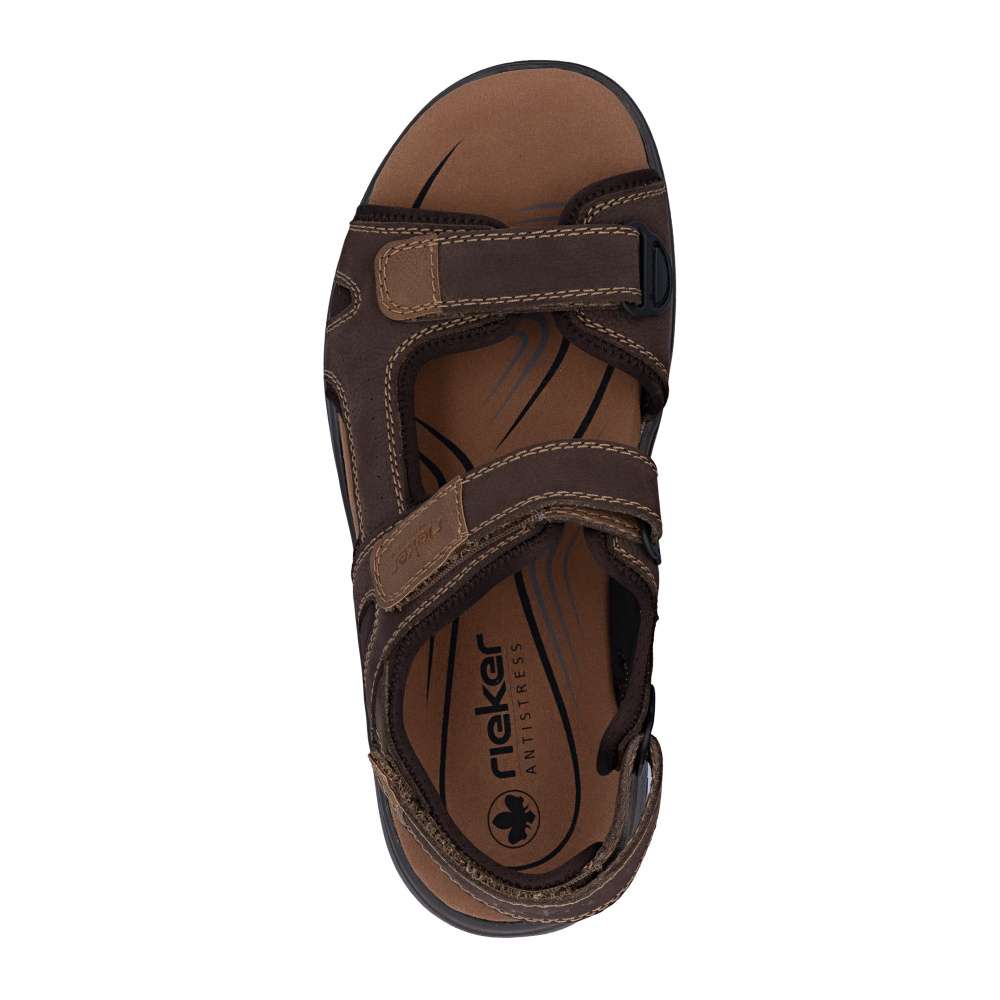 Pánské sandály RIEKER jsou ideální volbou pro muže, kteří hledají spojení pohodlí, kvality a nadčasového stylu. Hnědý kožený svršek je tvořen třemi pásky se suchým zipem – dva pásky přes nárt umožňují individuální nastavení šířky a dokonalé přizpůsobení chodidlu, zatímco zadní pásek usnadňuje nazutí a zajišťuje stabilní upevnění nohy. Textilní stélka je navržena tak, aby poskytovala příjemný pocit při kontaktu s chodidlem a podporovala pohodlnou chůzi po celý den. Podešev tlumící nárazy efektivně snižuje tlak při došlapu a absorbuje nárazy při pohybu, čímž přispívá k komfortu i při delším nošení. Pánské sandály RIEKER jsou skvělou volbou pro každodenní nošení, do práce, na procházky nebo na dovolenou.