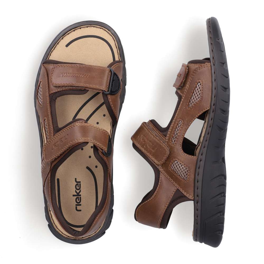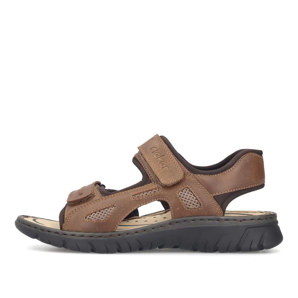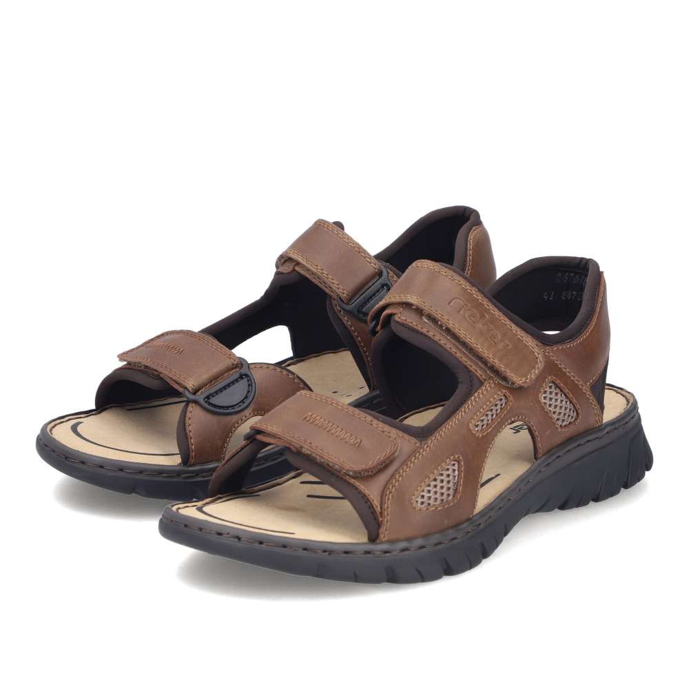 Tyto pánské sandály značky RIEKER v moderním stylu spojují pohodlí s nadčasovým designem. Hnědý svršek ve spojení hladkého materiálu s textilními prvky vytváří vizuálně atraktivní a nadčasovou kombinaci barev a struktur, která se snadno kombinuje s jakýmkoli letním outfitem. Diskrétní logo značky RIEKER dodává sandálům prestižní charakter a podtrhuje jejich kvalitu. Praktické dva nastavitelné pásky na suchý zip umožňují snadné obouvání a přesné přizpůsobení tvaru nohy. Komfortní textilní stélka poskytuje příjemný pocit při každém kroku a flexibilní podešev s tlumením nárazů chrání klouby a zajišťuje lehký a přirozený došlap. Tyto sandály jsou ideální nejen pro běžné nošení po městě, ale také pro volnočasové aktivity, výlety či dovolené. Díky lehkosti, prodyšnosti a promyšlenému designu poskytují pocit komfortu a stylu po celý den.