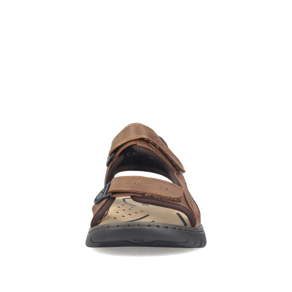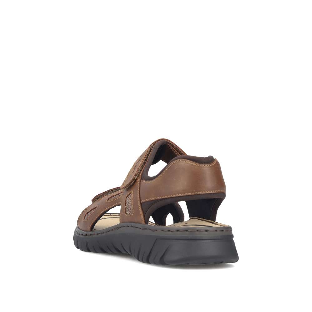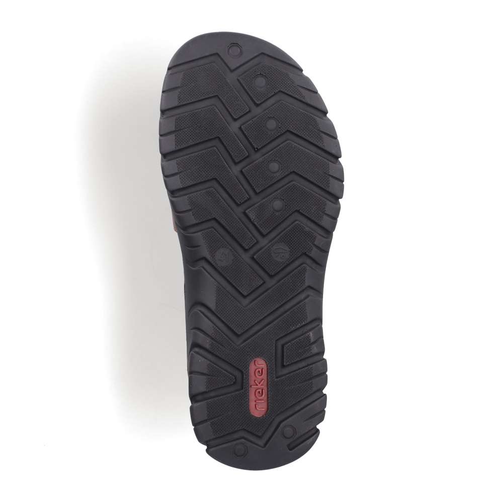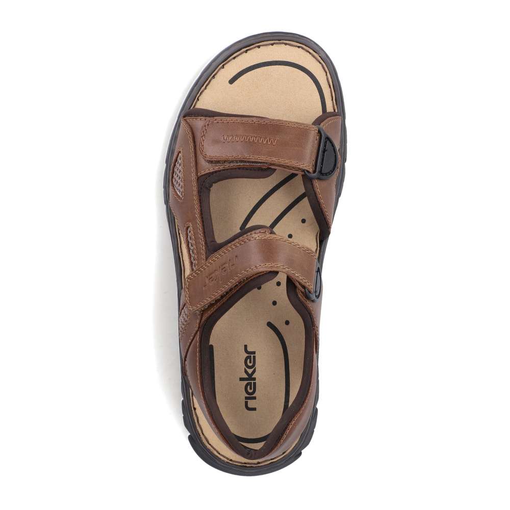 Tyto pánské sandály značky RIEKER v moderním stylu spojují pohodlí s nadčasovým designem. Hnědý svršek ve spojení hladkého materiálu s textilními prvky vytváří vizuálně atraktivní a nadčasovou kombinaci barev a struktur, která se snadno kombinuje s jakýmkoli letním outfitem. Diskrétní logo značky RIEKER dodává sandálům prestižní charakter a podtrhuje jejich kvalitu. Praktické dva nastavitelné pásky na suchý zip umožňují snadné obouvání a přesné přizpůsobení tvaru nohy. Komfortní textilní stélka poskytuje příjemný pocit při každém kroku a flexibilní podešev s tlumením nárazů chrání klouby a zajišťuje lehký a přirozený došlap. Tyto sandály jsou ideální nejen pro běžné nošení po městě, ale také pro volnočasové aktivity, výlety či dovolené. Díky lehkosti, prodyšnosti a promyšlenému designu poskytují pocit komfortu a stylu po celý den.