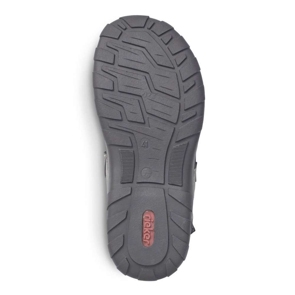 Kožený svršek je ozdoben kontrastním prošíváním, povrchovou perforací a vytlačeným nápisem Rieker. Pro maximální komfort při nošení a snadné nazouvání jsou pásky vybaveny suchými zipy.