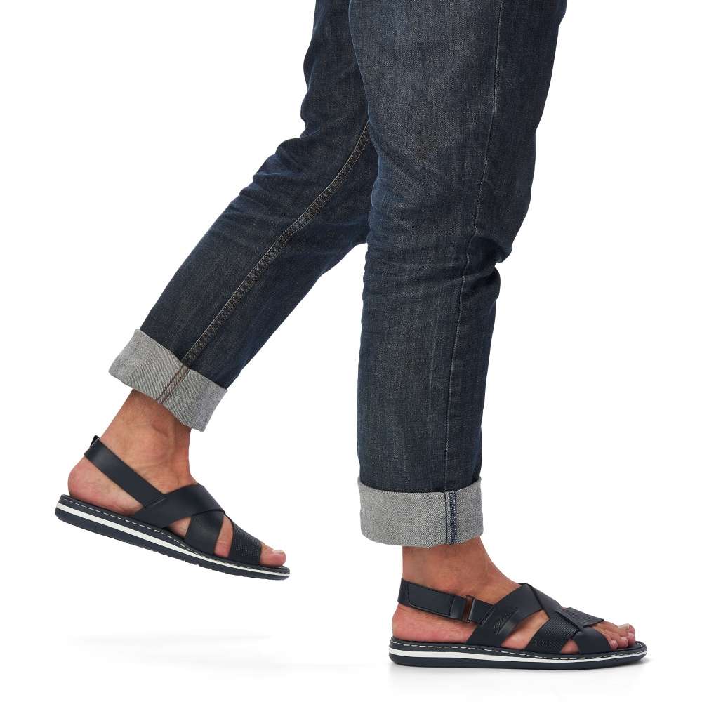 Tento model sandálů značky RIEKER bude tou správnou volbou na Vaše letní procházky. Širší pásky hladkého a vzorovaného vzhledu jsou na nártu šikovně překříženy. Snadné nazouvání a přizpůsobení dle Vašich požadavků zajistí pásek kolem paty se zapínáním na suchý zip. Měkká stélka zajistí pohodlí na každém kroku a kvalitní pruhovaná podešev je ozdobena šitím. Tyto sandály budou skvěle vypadat jak s kraťasy, tak i s kalhotami. Technologie: Antistress – podešev je díky této technologii lehká, flexibilní, absorbuje nárazy při došlapu a snadno se přizpůsobí každé noze.