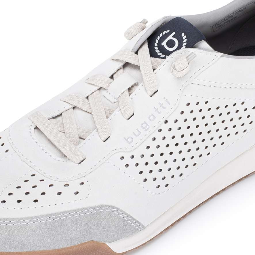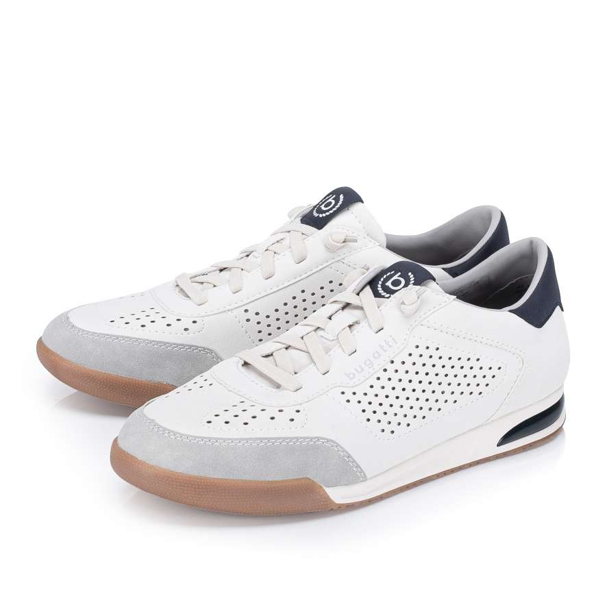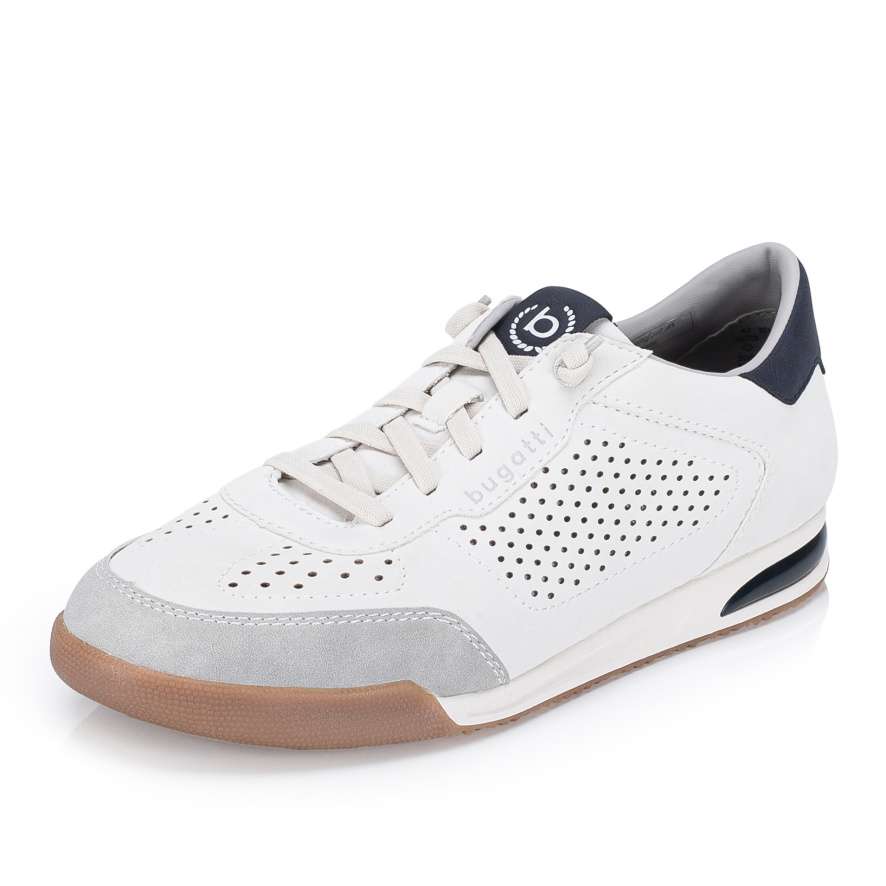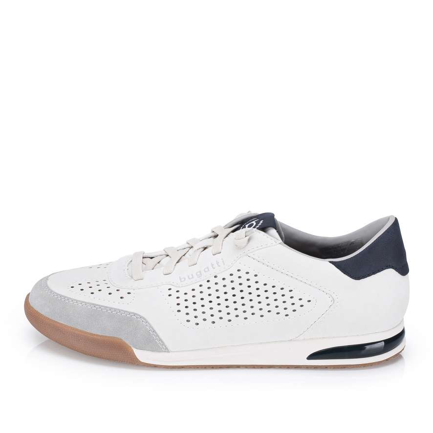 Boty BUGATTI jsou zárukou pohodlí i moderního vzhledu, který skvěle doplní váš každodenní styl. Bílý svršek se vzorem perforace a kontrastně modrými aplikacemi působí jedinečně a zároveň zajišťuje lepší prodyšnost, což přispívá k příjemnému pocitu při nošení. Praktická pružná gumička namísto šněrovaní umožňuje jednoduché nazutí a přizpůsobení tvaru nohy. Stélka je příjemně měkká a flexibilní podešev poskytuje potřebnou pružnost při každém kroku, takže se můžete spolehnout na pohodlí po celý den. Boty BUGATTI jsou skvělou volbou pro muže, kteří hledají stylovou a pohodlnou obuv pro každodenní nošení.
