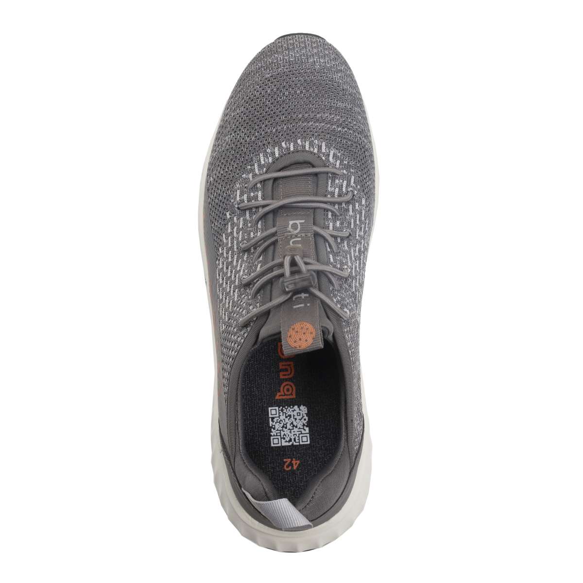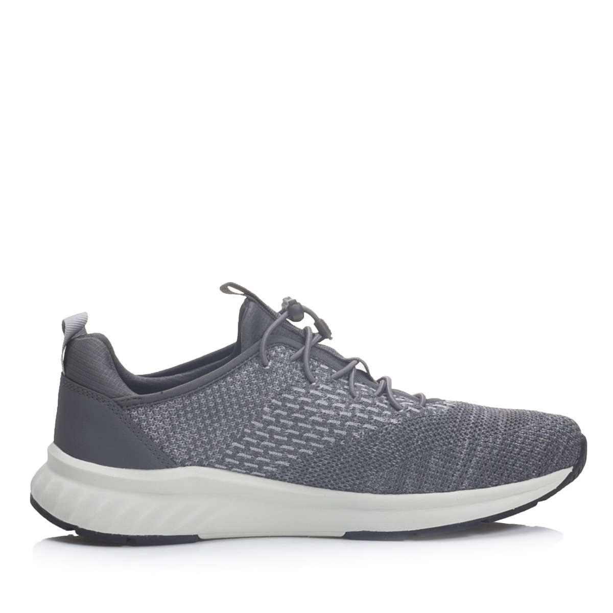 Pružný textilní svršek světlé barvy je doplněn tmavě šedými prvky, kontrastním červeným nápisem s názvem značky a šněrování pružnou gumičkou zajistí snadné nazouvání.
