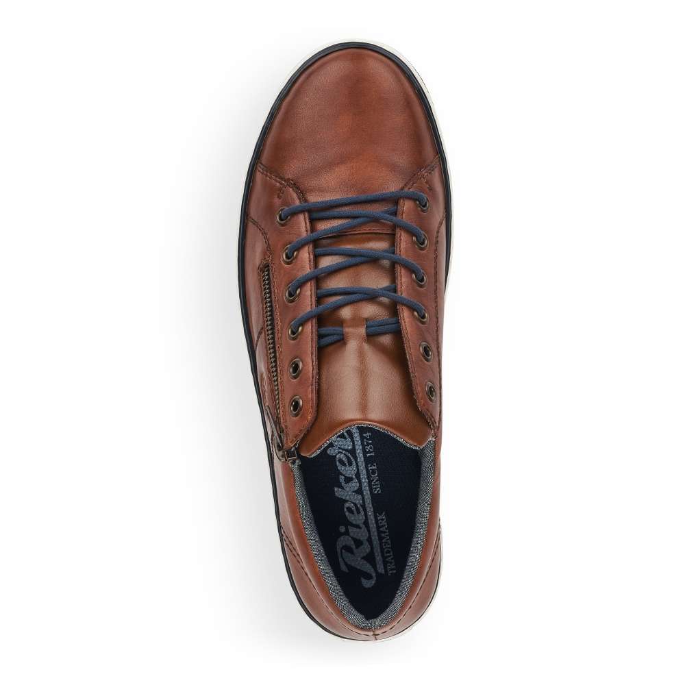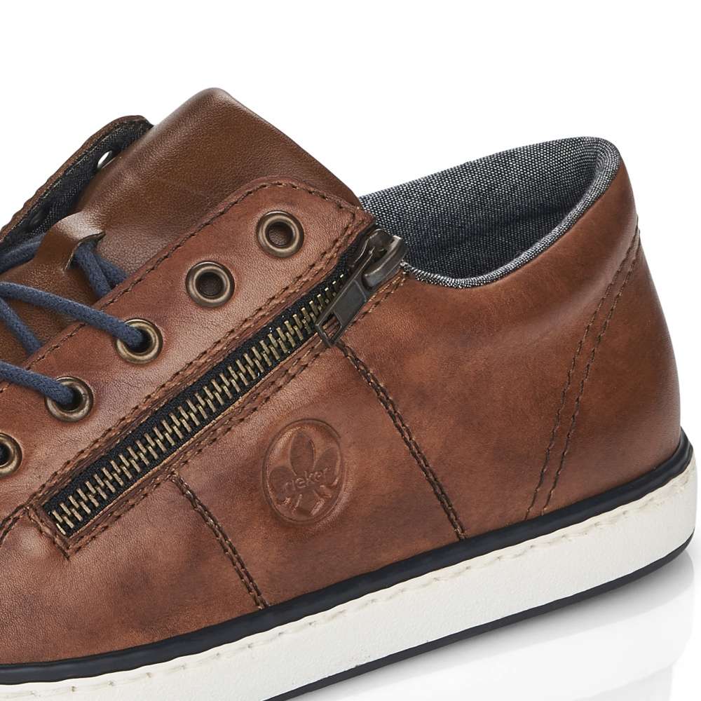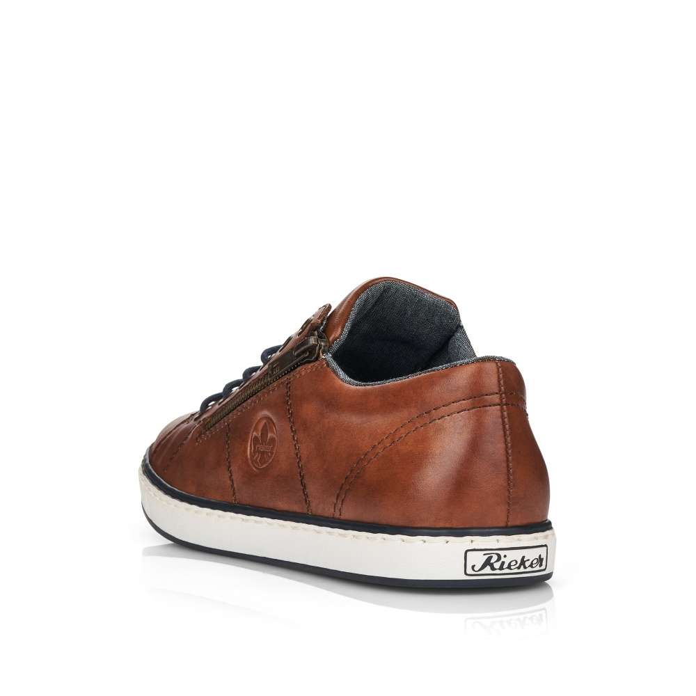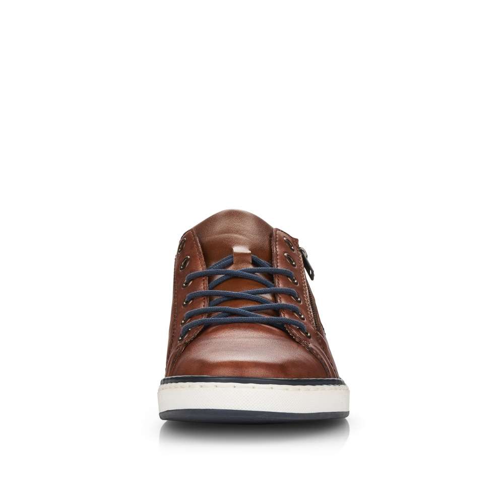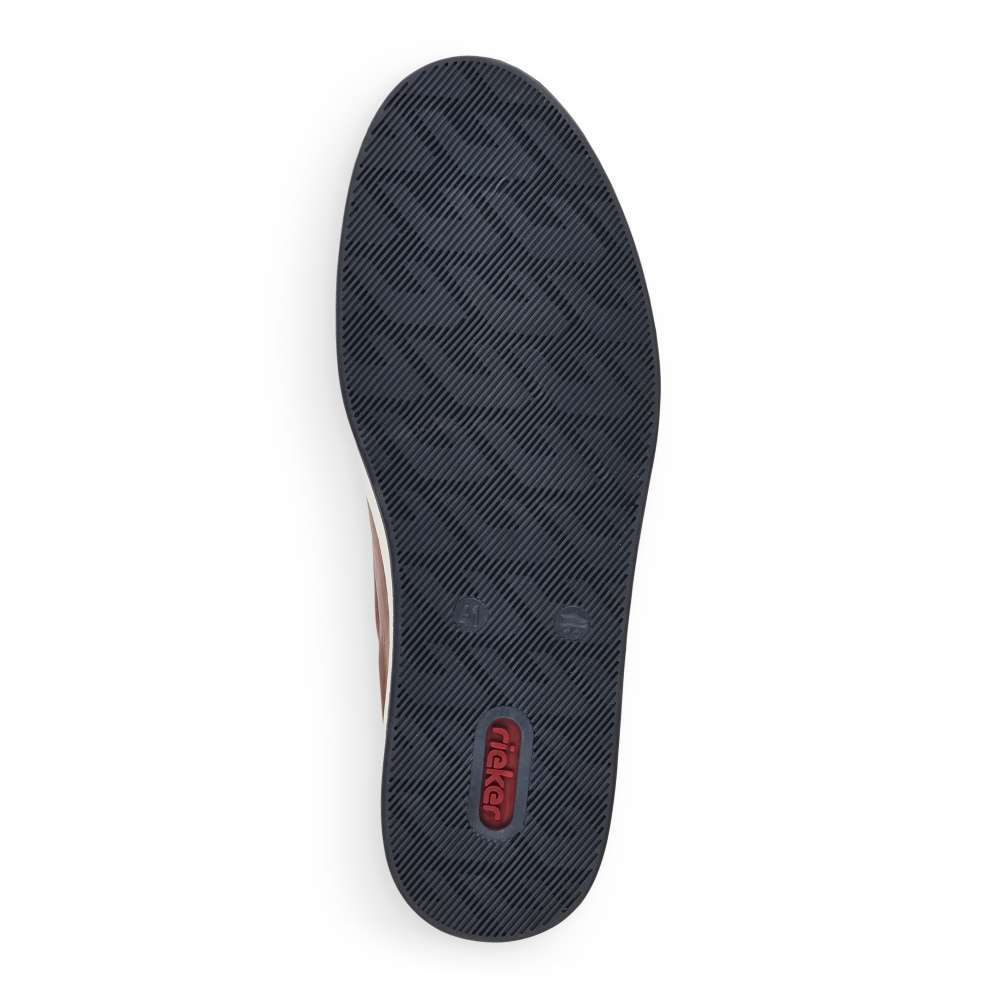 Tento model tenisek elegantního vzhledu vznikl v dílně značky RIEKER. Hladký kožený svršek je zdobný jemným kontrastním prošíváním, vytlačeným logem značky a snadné nazouvání zajistí jak tmavě modré tkaničky, tak funkční zip šikovně umístěný na vnější straně obuvi. Stélka je pro Vaše pohodlí vyrobena z měkkého materiálu a podešev svou bílou barvou dolaďuje celkový vzhled k dokonalosti. Na procházky městem či na pracovní jednání bude tato obuv skvělou volbou.
