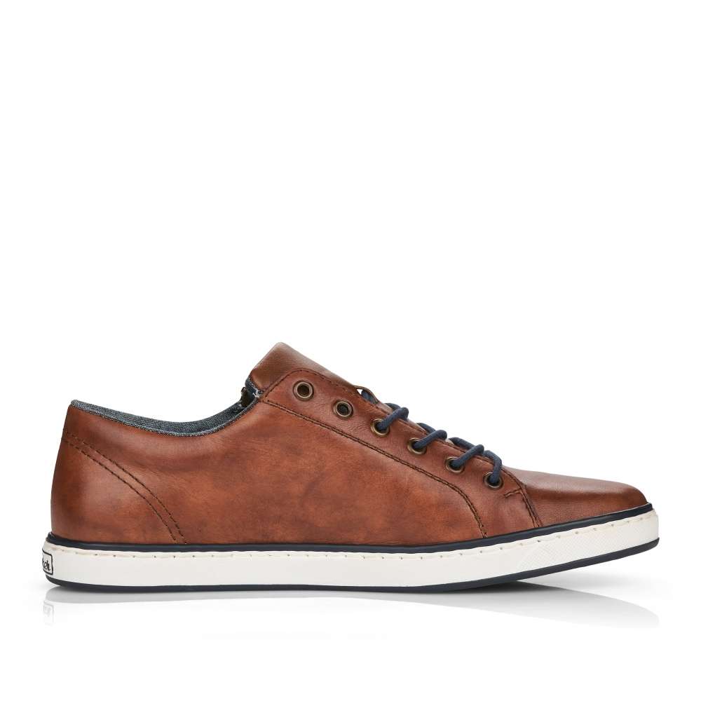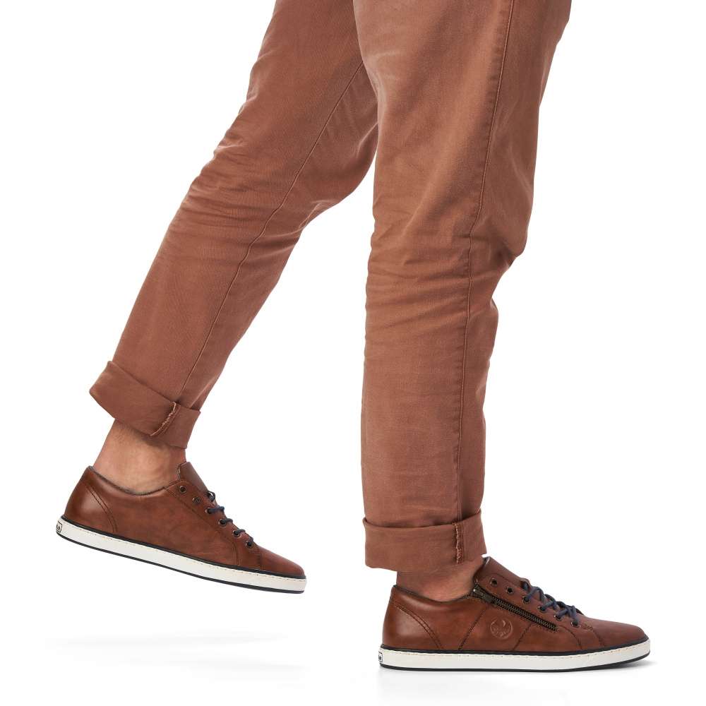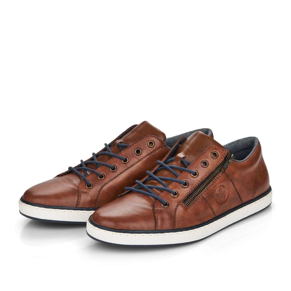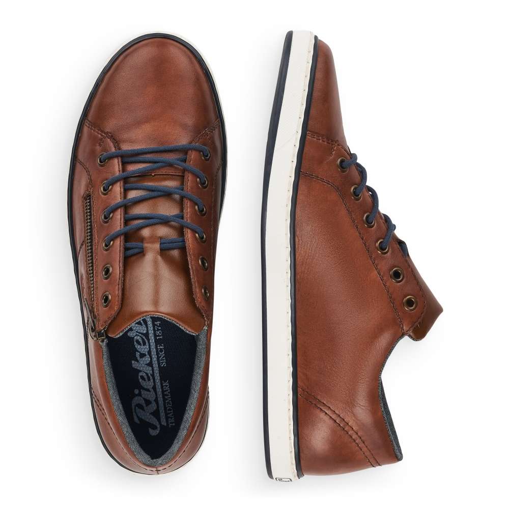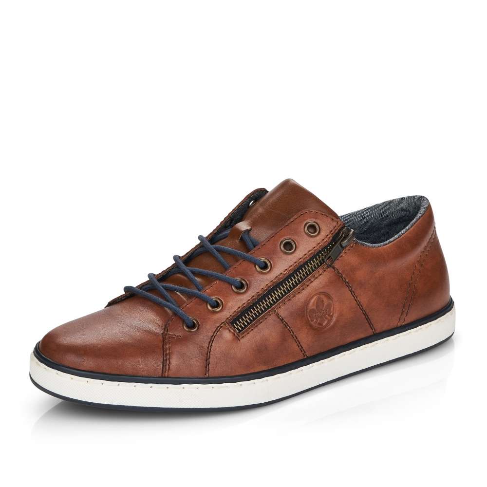 Tento model tenisek elegantního vzhledu vznikl v dílně značky RIEKER. Hladký kožený svršek je zdobný jemným kontrastním prošíváním, vytlačeným logem značky a snadné nazouvání zajistí jak tmavě modré tkaničky, tak funkční zip šikovně umístěný na vnější straně obuvi. Stélka je pro Vaše pohodlí vyrobena z měkkého materiálu a podešev svou bílou barvou dolaďuje celkový vzhled k dokonalosti. Na procházky městem či na pracovní jednání bude tato obuv skvělou volbou.