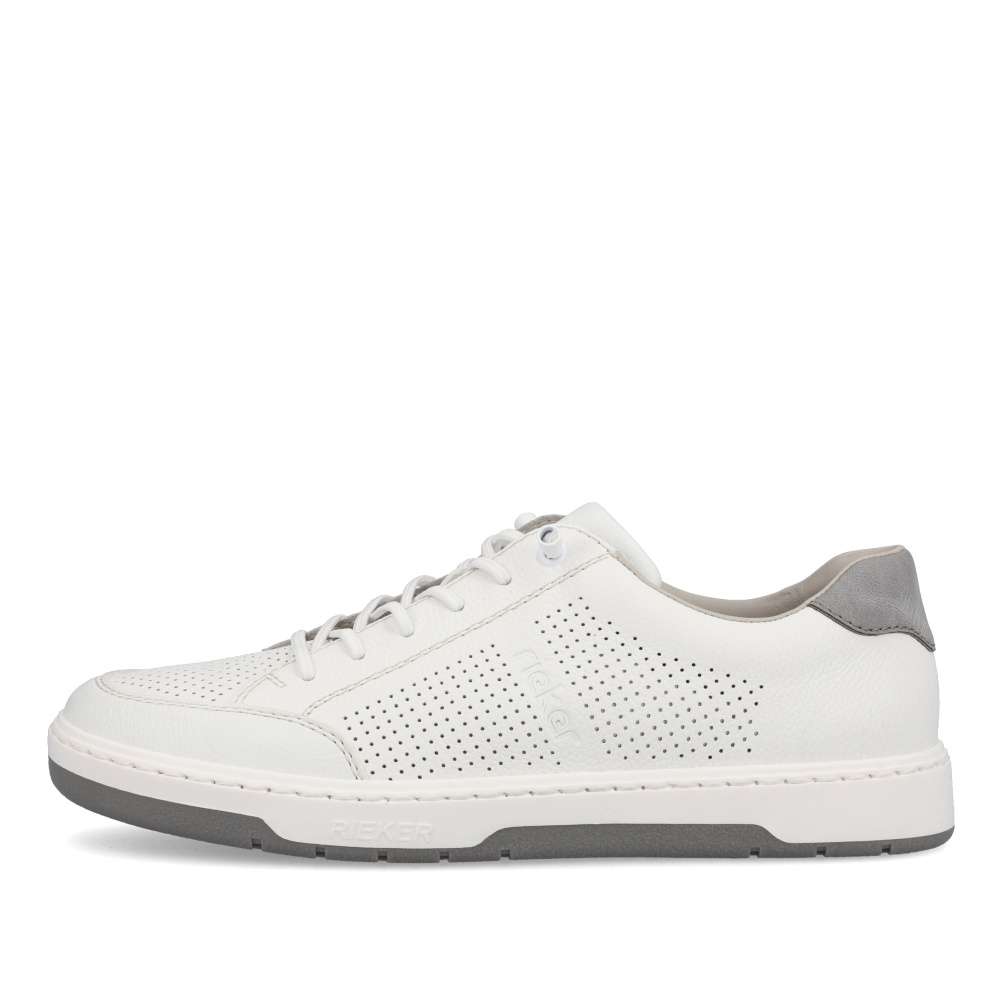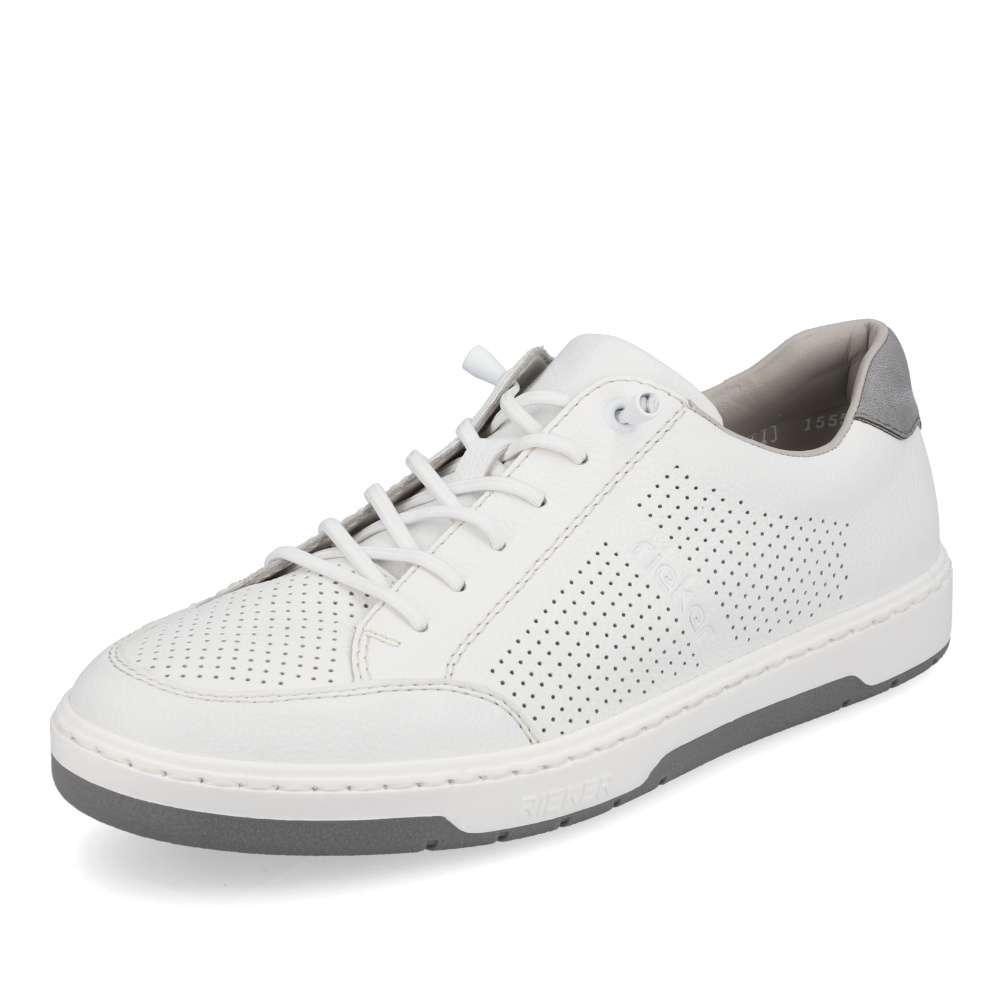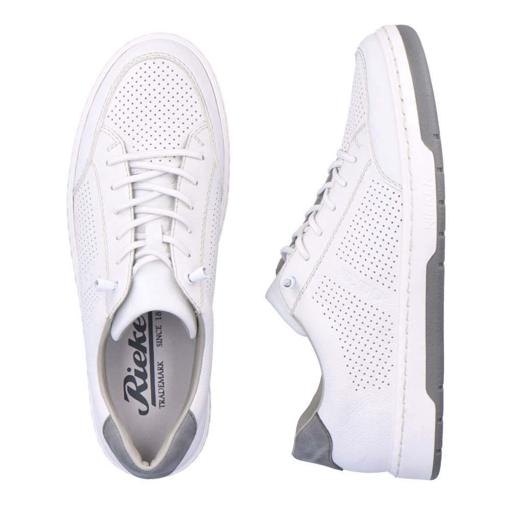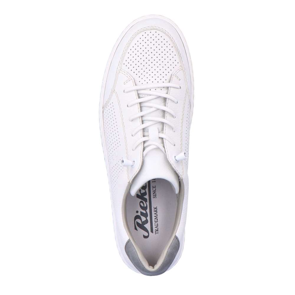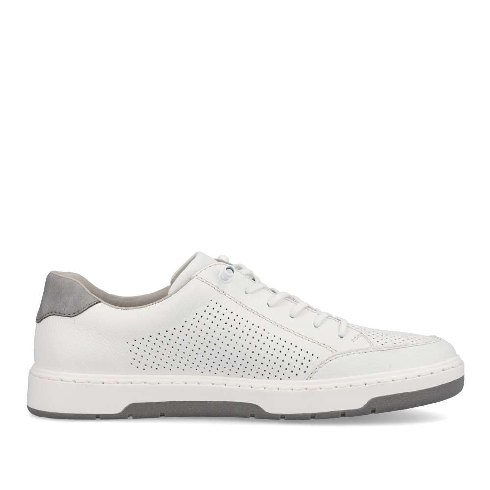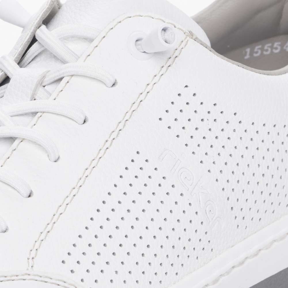 Tyto bílé ležérní tenisky od značky Rieker jsou vhodnou volbou na jarní a letní dny. Svršek je z pravé kůže a je v oblasti špičky a po stranách perforovaný, což umožní cirkulaci vzduchu. O snadné nazouvání se postarají pružné gumičky, které nahrazují klasické šněrování. Pohodlí na každém kroku zajistí měkká kožená stélka. Tento model bude skvělým společníkem každého moderního muže.