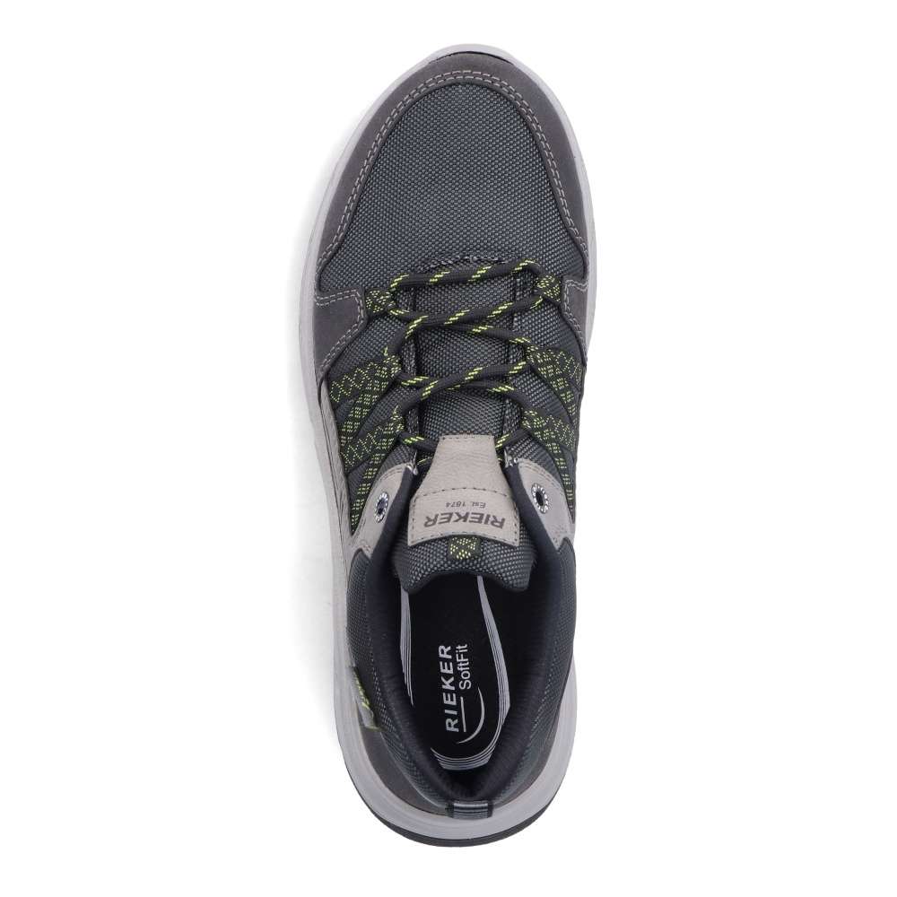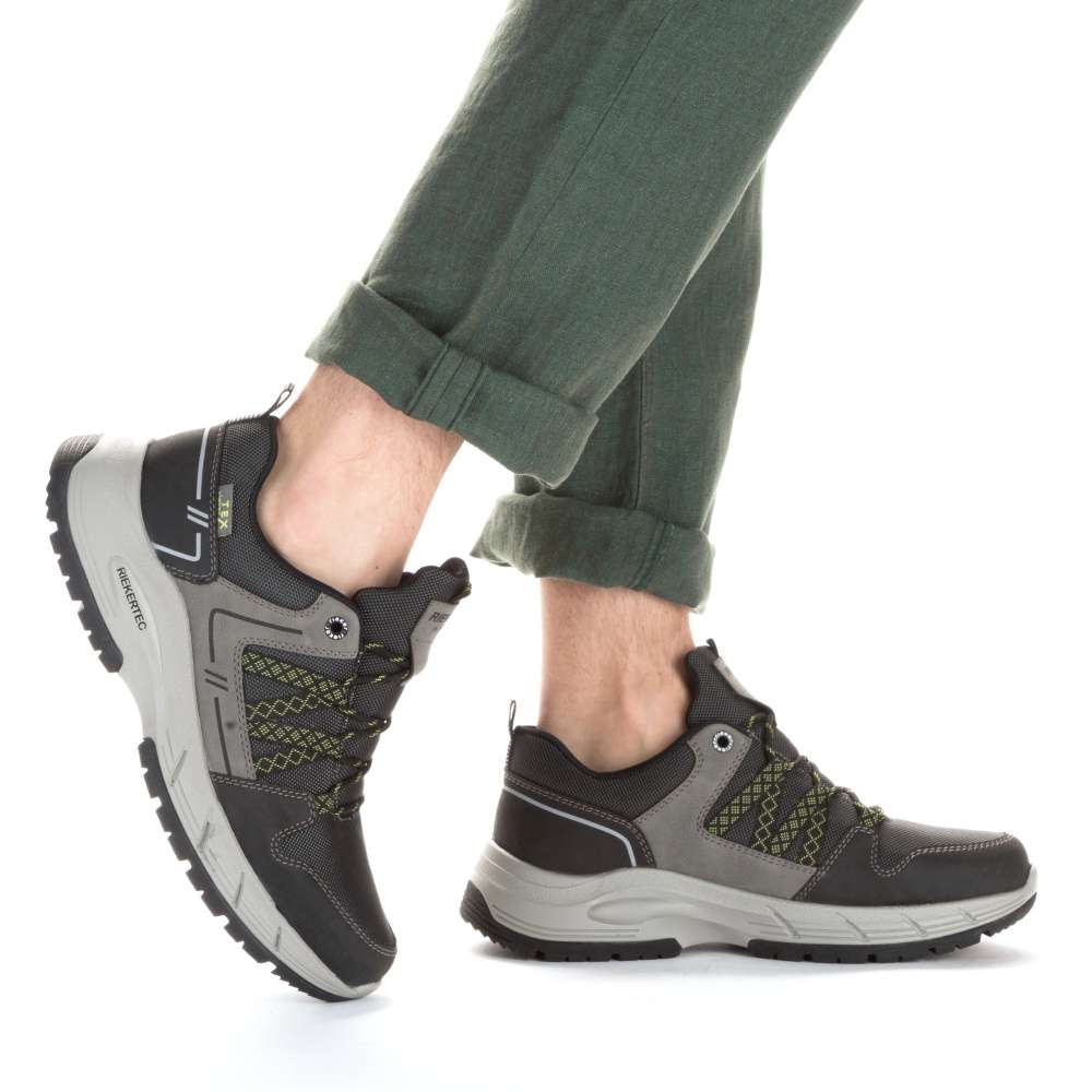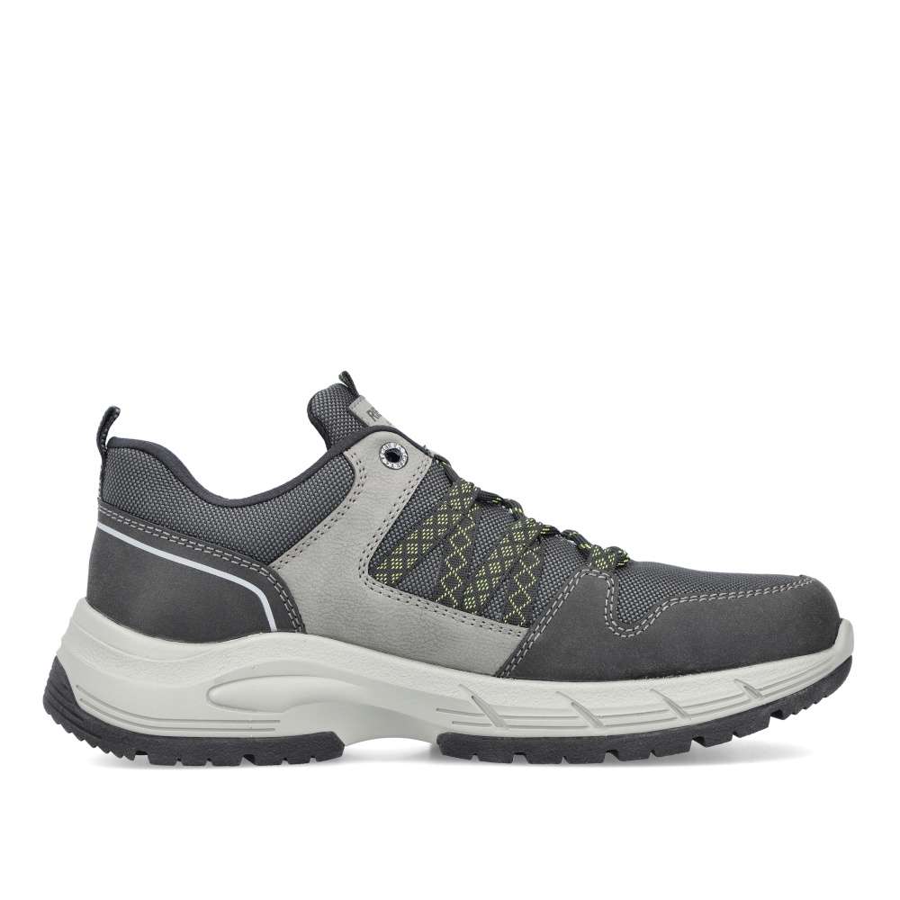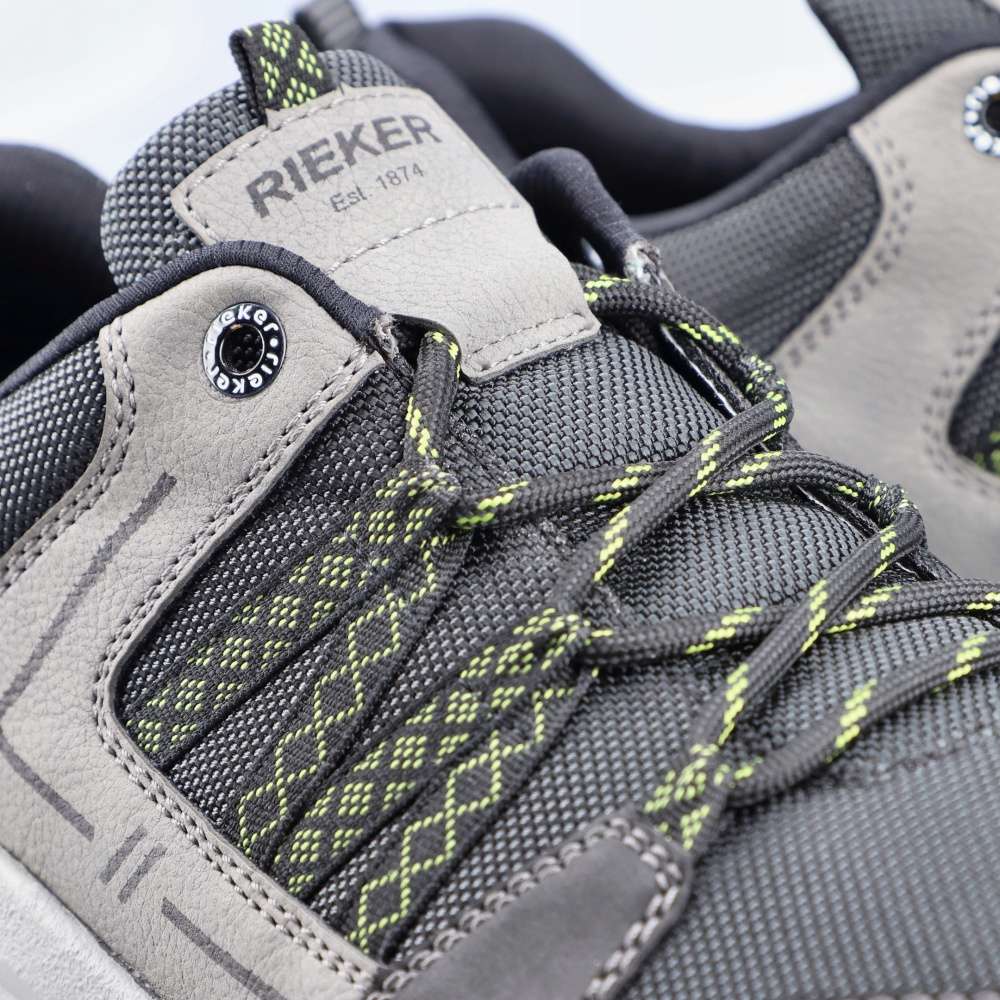 Sportovní tenisky značky RIEKER čekají v naší nabídce přímo na Vás. Šedý svršek v kombinaci s nepromokavým textilem, nápisem RIEKER na jazyku a poutkem na patě pro lepší obutí. Snadné nazutí zajistí pevné tkaničky a pohodlí na každém kroku budete mít s paměťovou vyjímatelnou stélkou MemoSoft. Šedá podešev s technologií antistress doladí vaše pohodlí k dokonalosti. Tento model oceníte k jakékoliv sportovní aktivitě nebo procházce se svým pejskem.