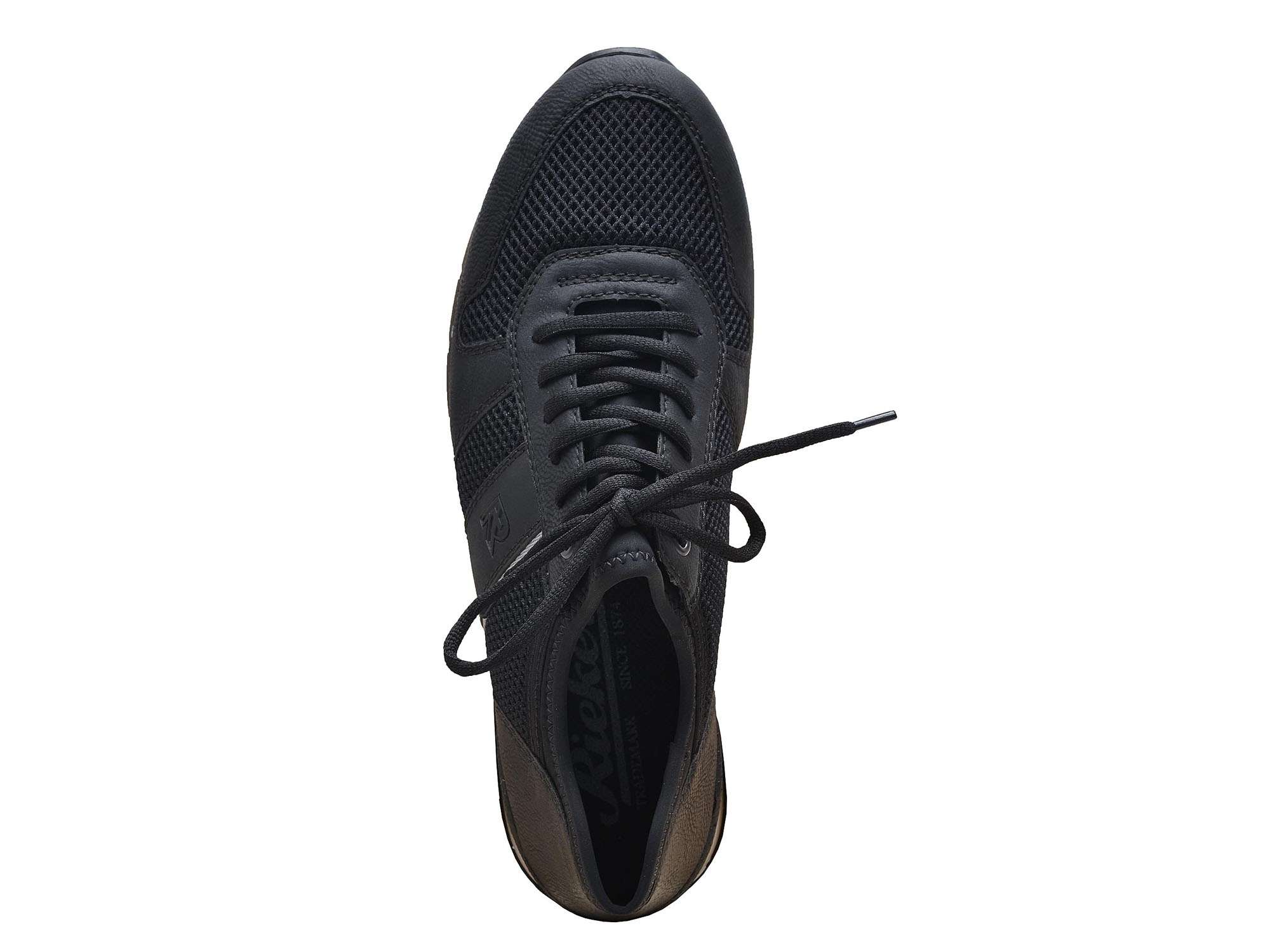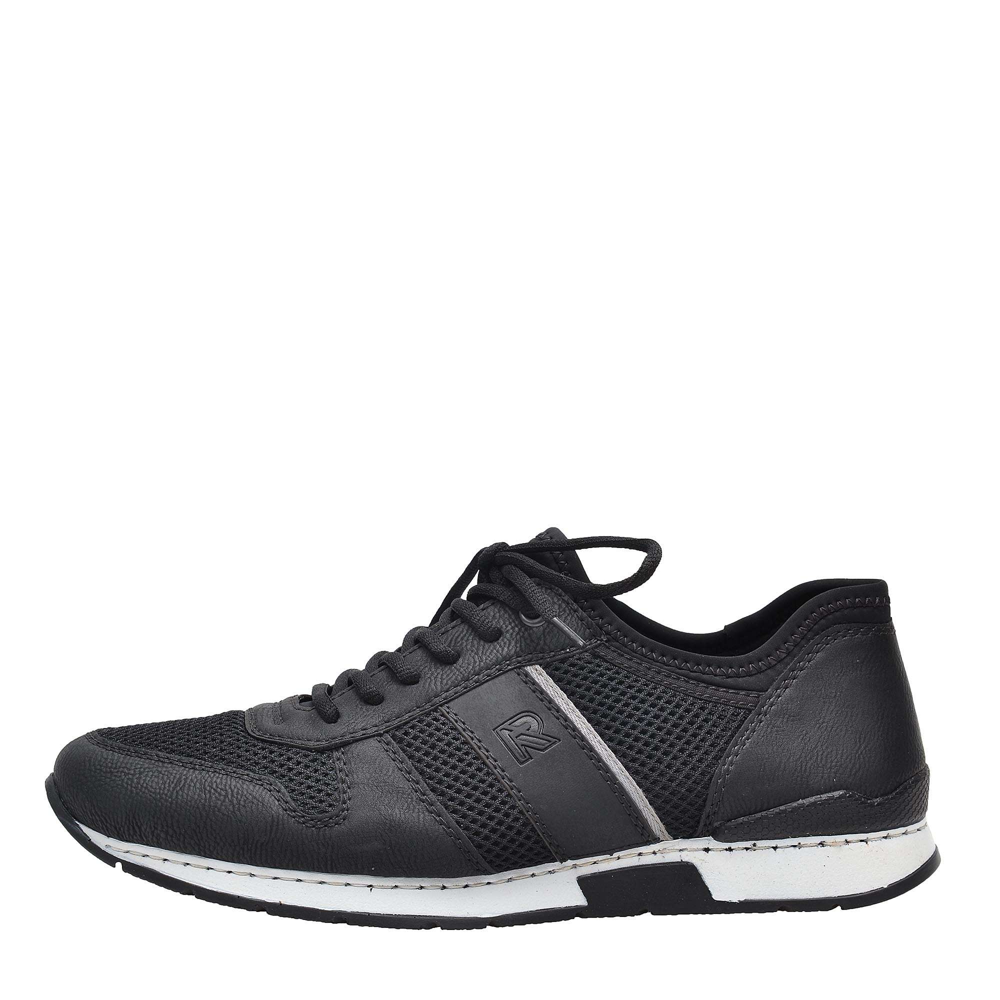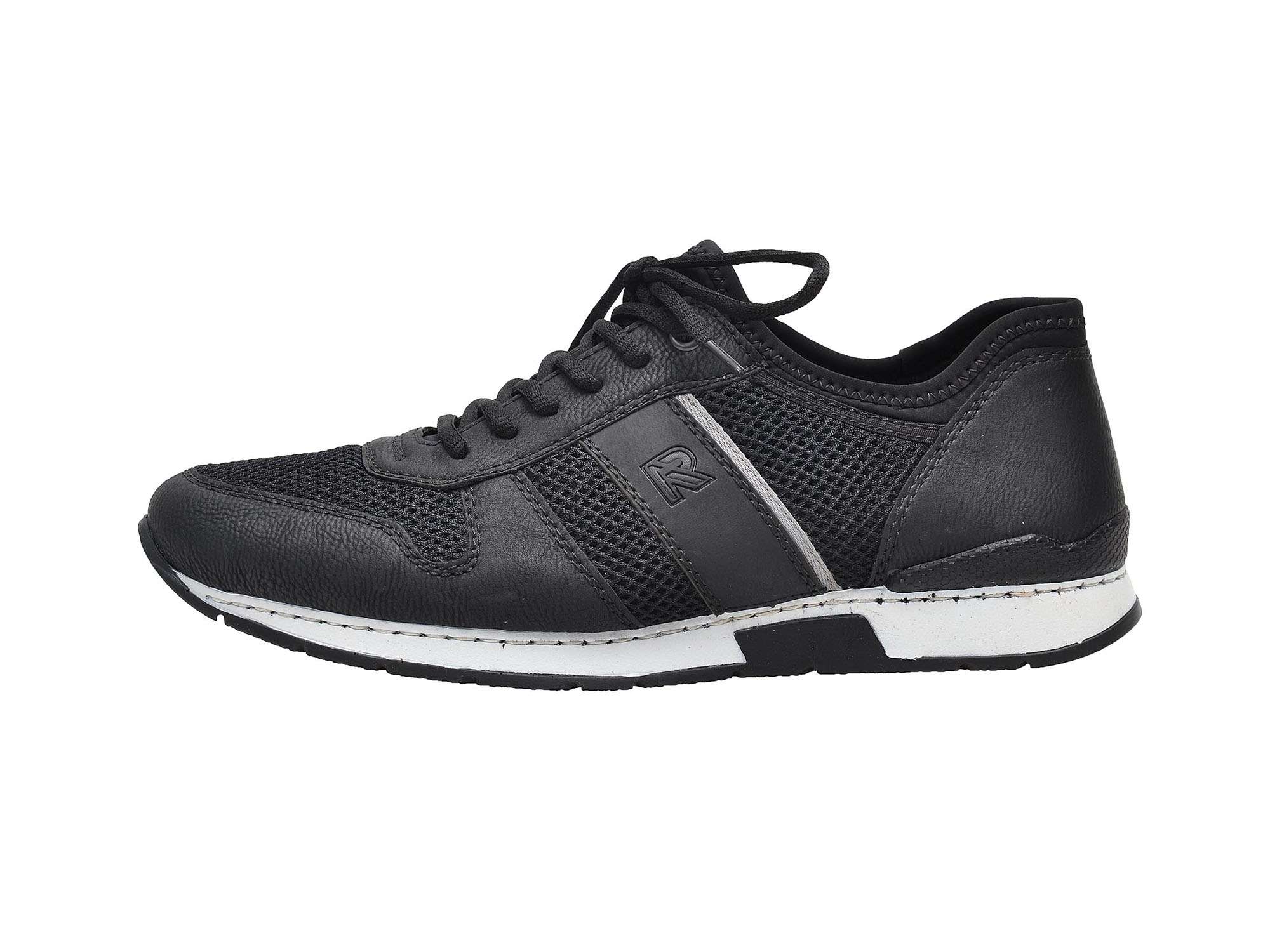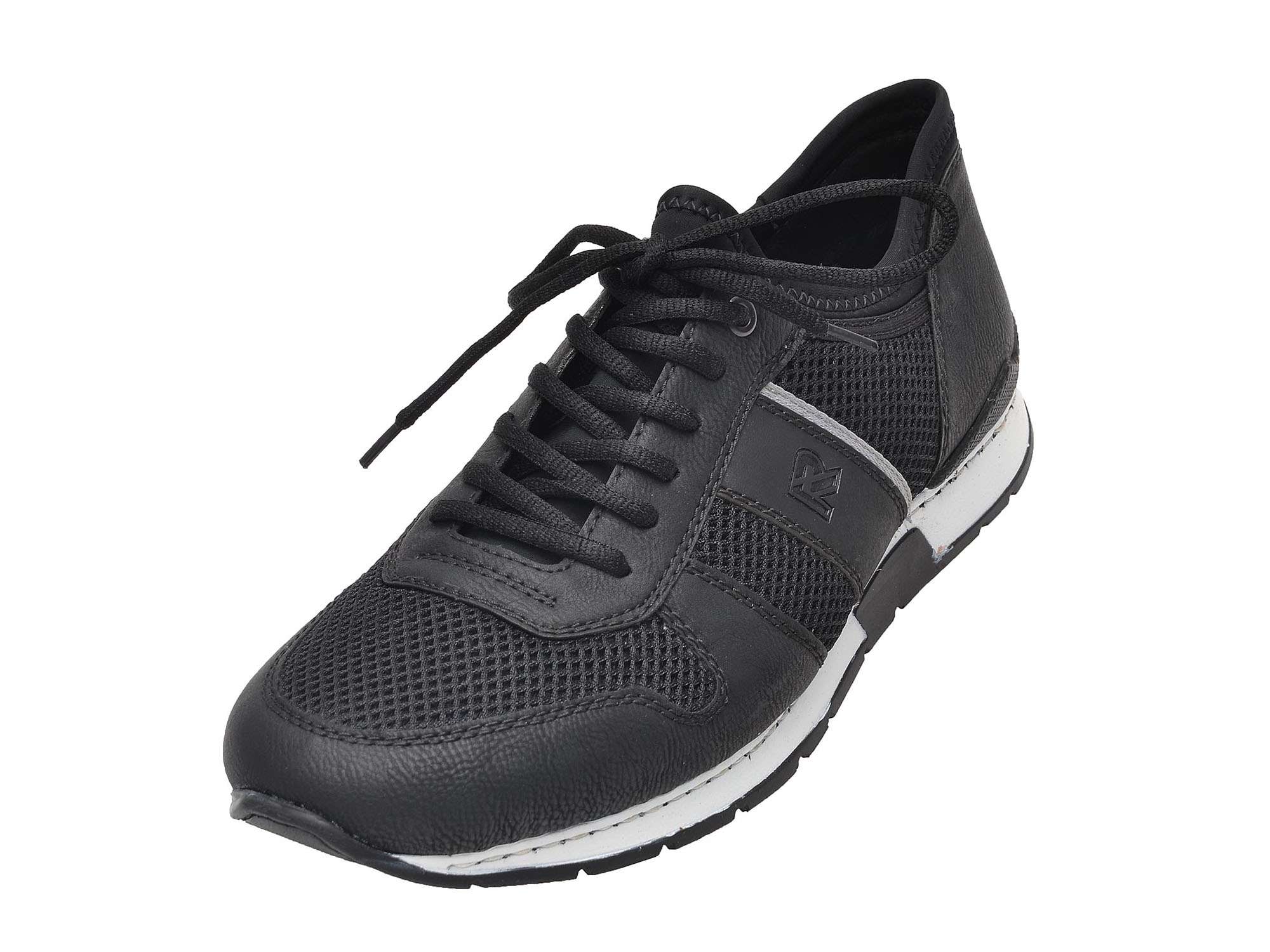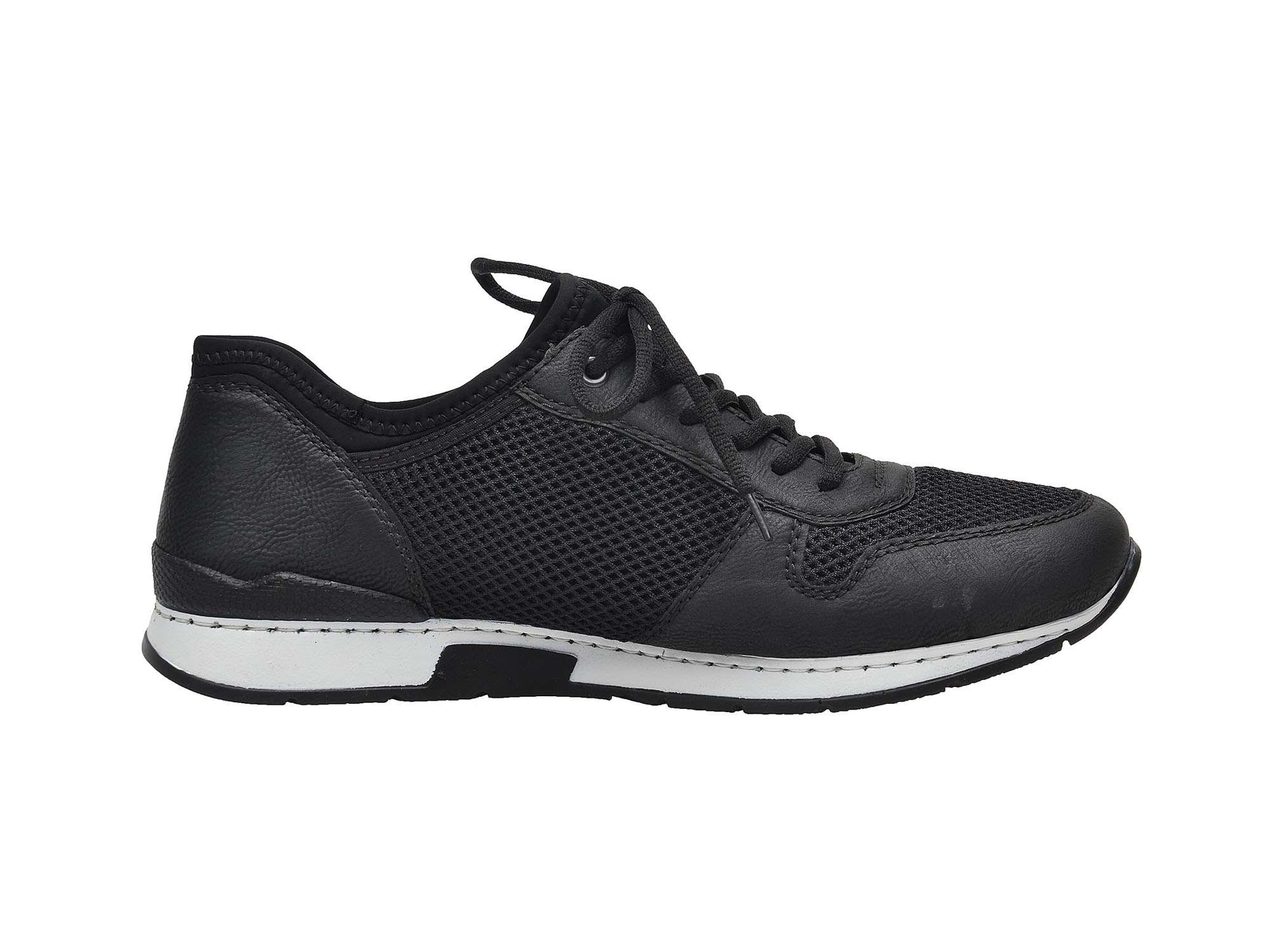 Šněrovací pánské tenisky značky RIEKER černé barvy, které se díky kombinaci hladkého povrchu s perforací skvěle hodí na každodenní nošení.