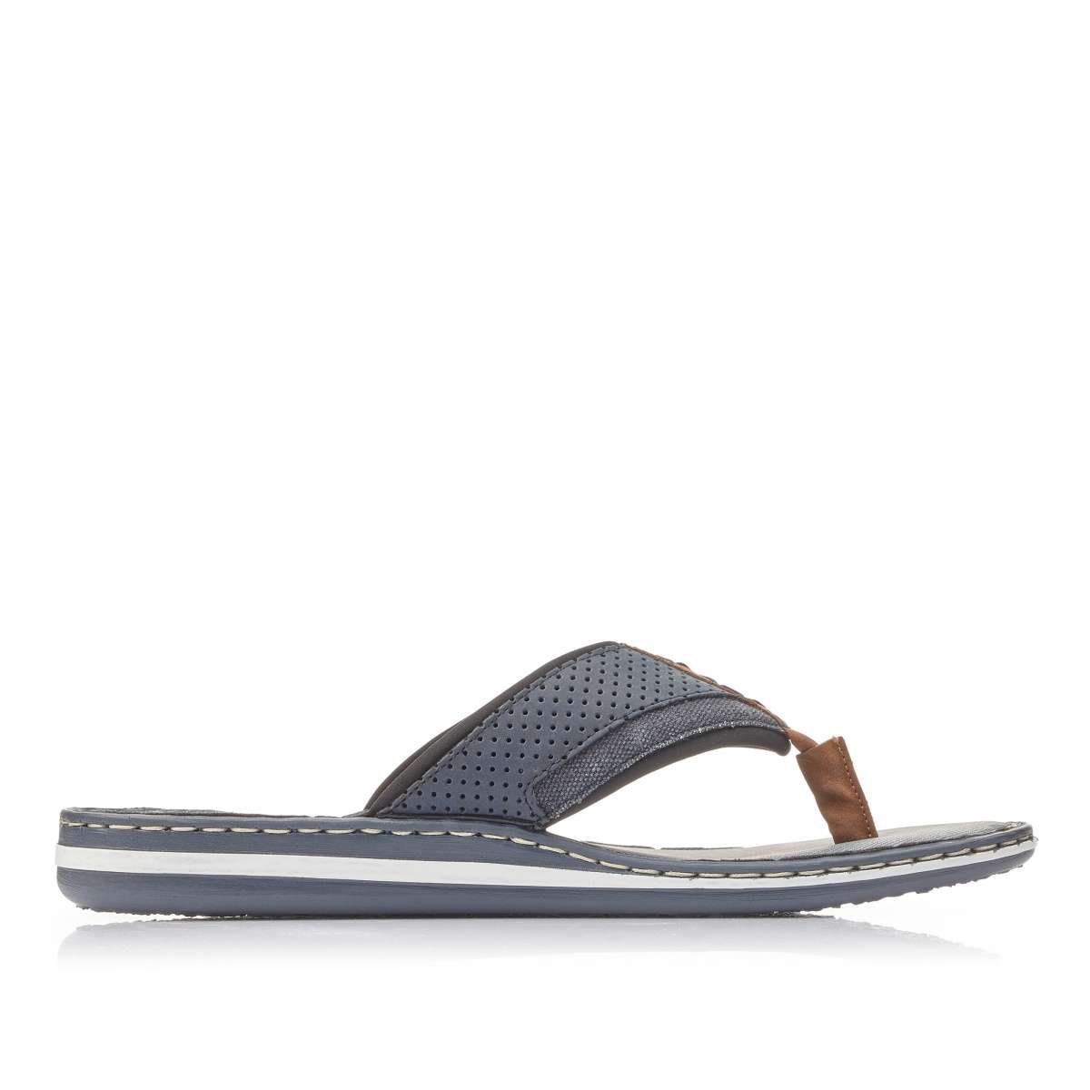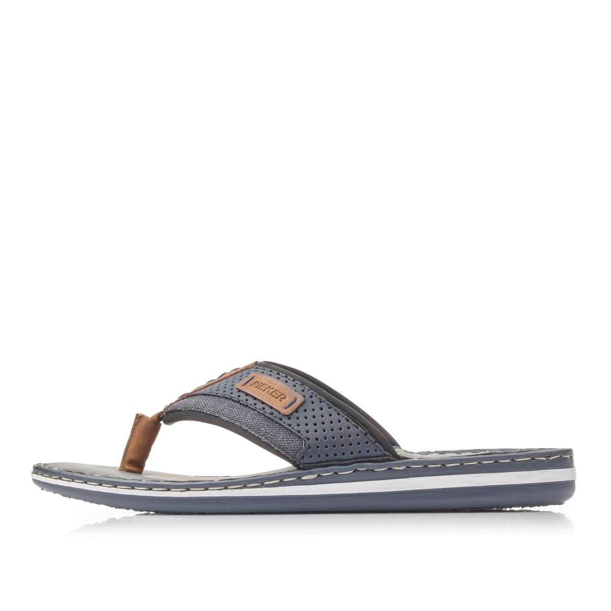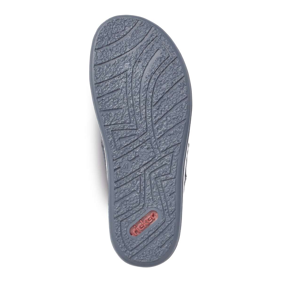 Pánské nazouváky žabkového stylu jsou zdobené kontrastním lemováním podešve i jejím šitím. Svršek má zajímavý perforovaný vzhled a kontrastní nášivku s nápisem Rieker. Tento velmi pohodlný vzor unosíte ke kraťasům do práce nebo na běžné pochůzky.
