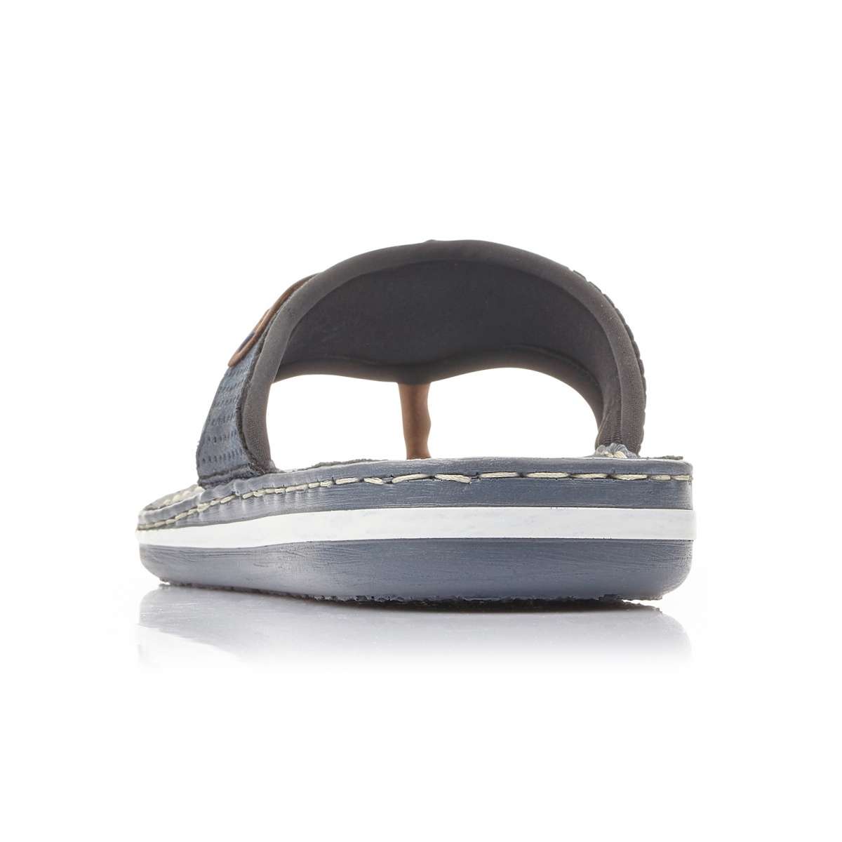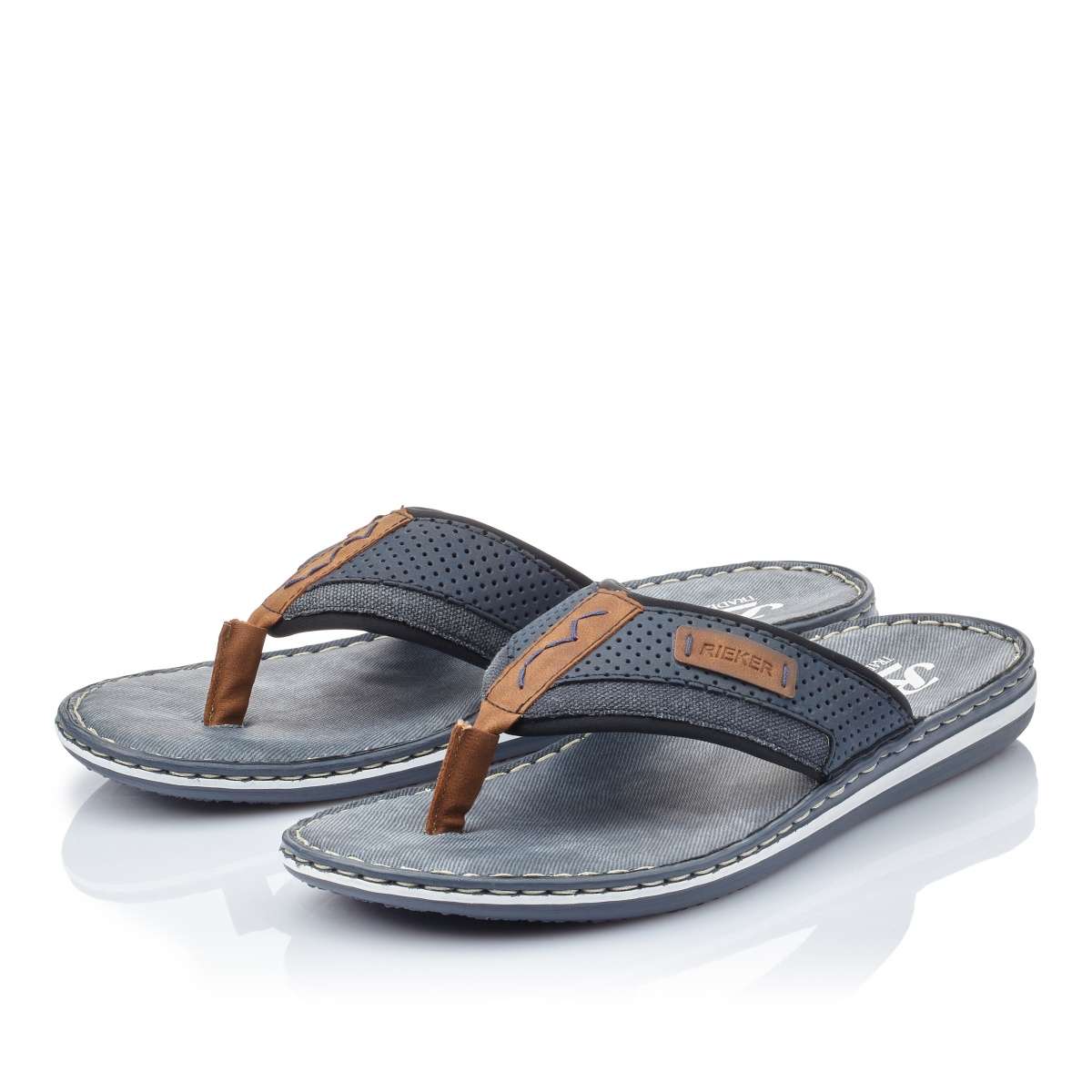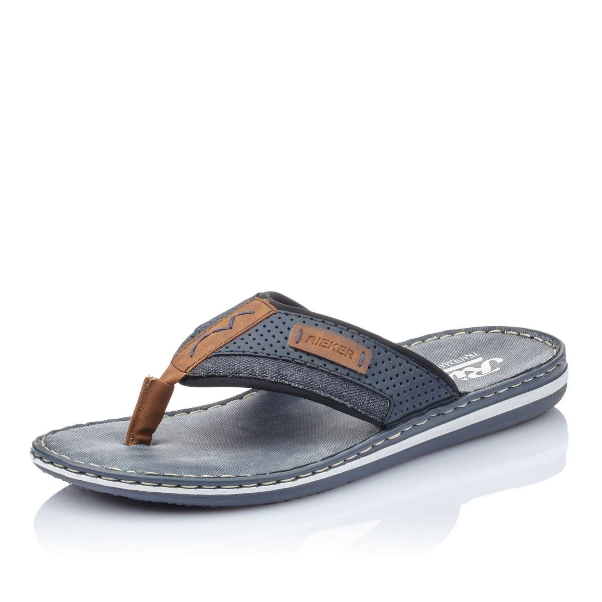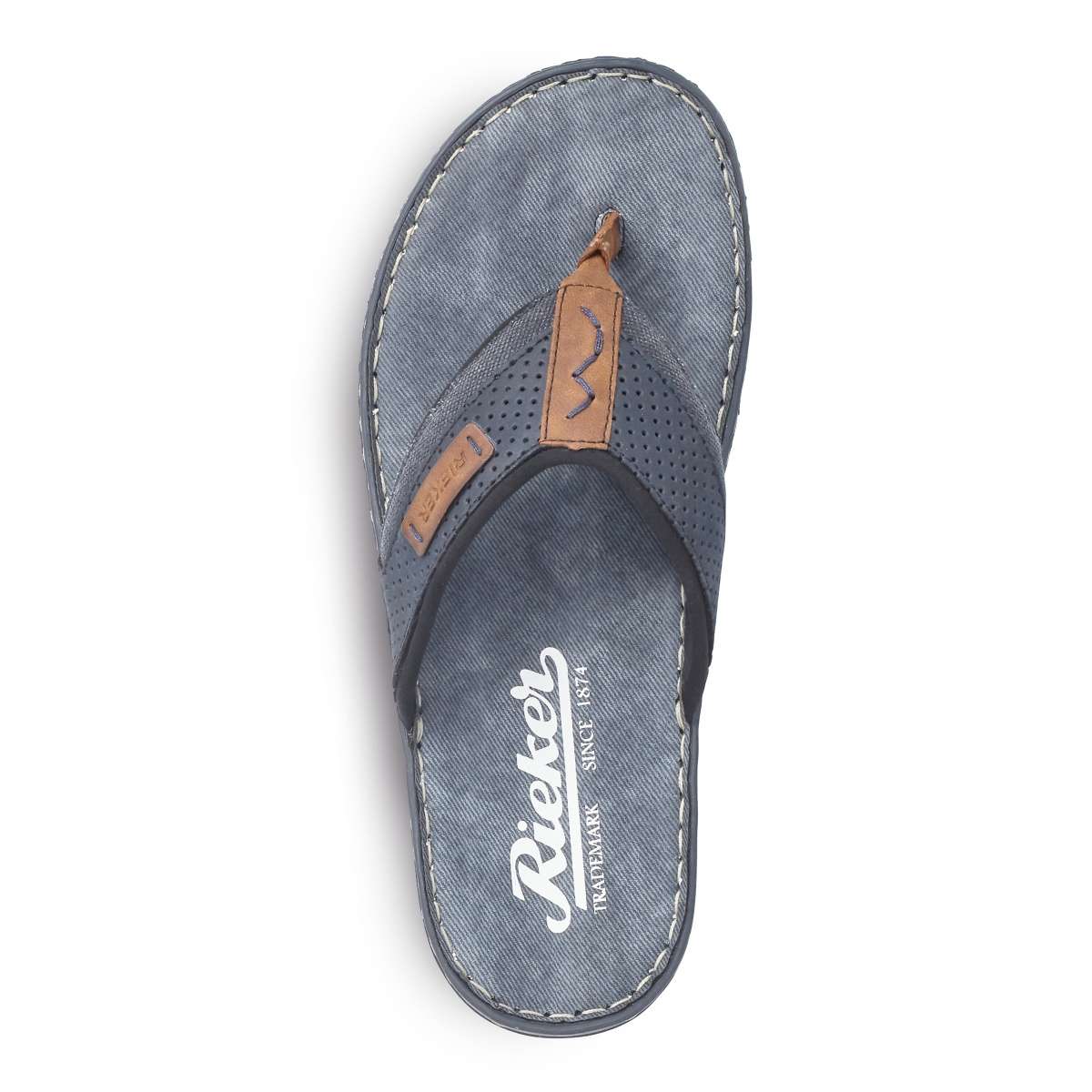 Pánské nazouváky žabkového stylu jsou zdobené kontrastním lemováním podešve i jejím šitím. Svršek má zajímavý perforovaný vzhled a kontrastní nášivku s nápisem Rieker. Tento velmi pohodlný vzor unosíte ke kraťasům do práce nebo na běžné pochůzky.